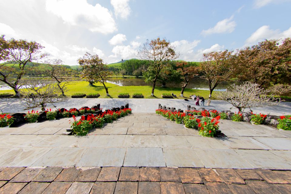 Hoa Tết khẽ tô điểm cảnh sắc lăng vua Tự Đức, làm dịu không gian vốn mang nhiều suy tưởng và chiều sâu lịch sử.