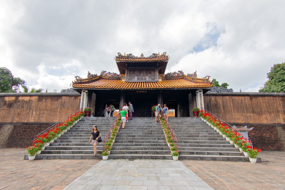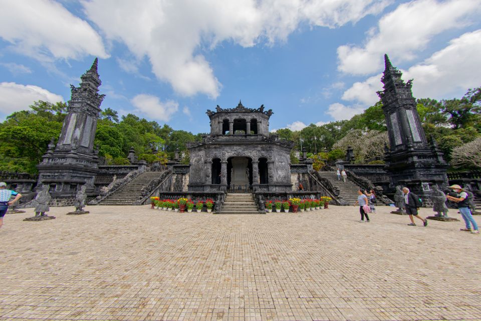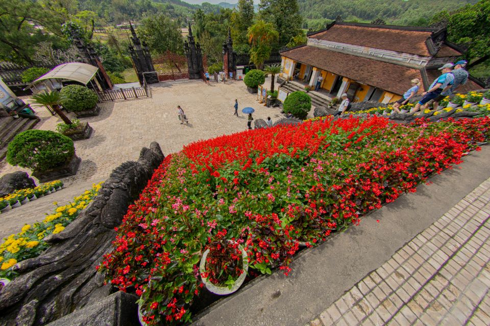 Lối đi lên được phủ đầy hoa, làm nổi bật vẻ lộng lẫy đặc trưng của lăng vua Khải Định.