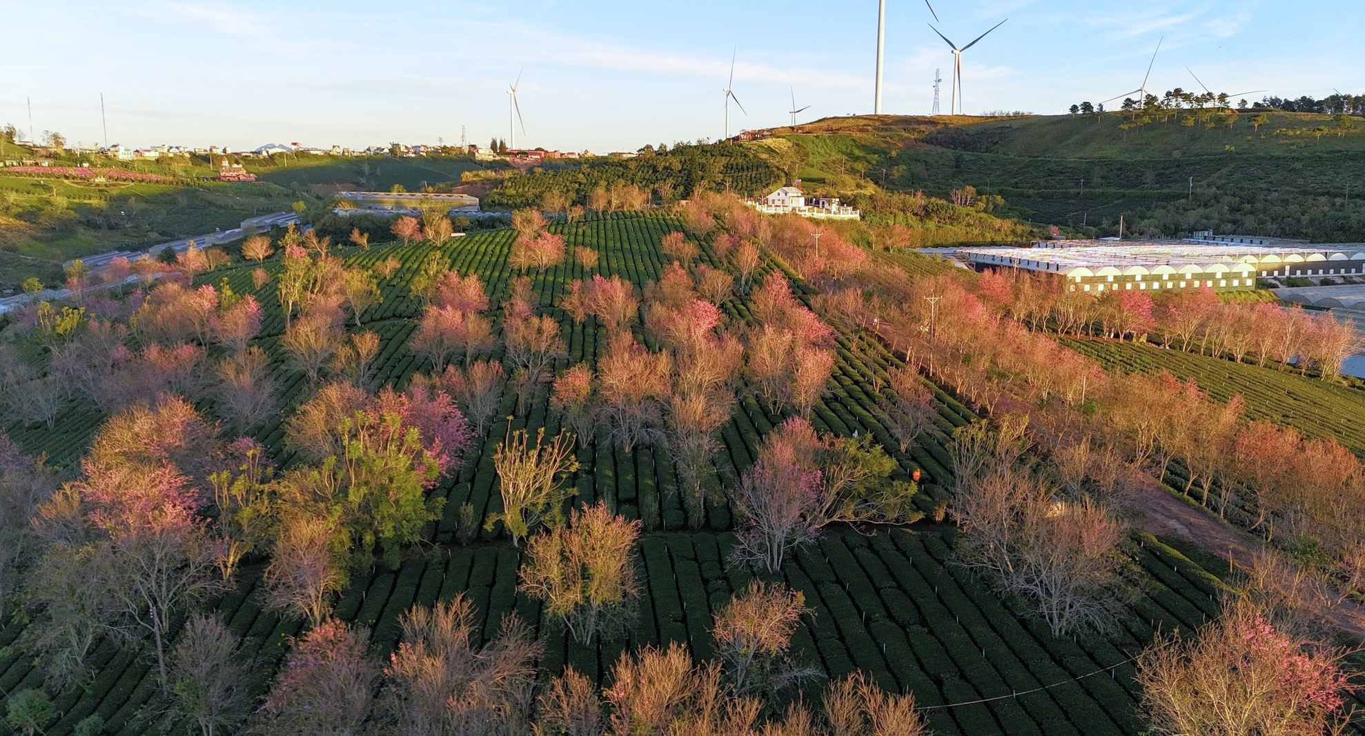 Khi quan sát từ trên cao, khu vực này tạo thành không gian cảnh quan kết hợp giữa màu xanh của đồi chè và sắc hồng của hoa mai anh đào. Ảnh: Bảo Ân