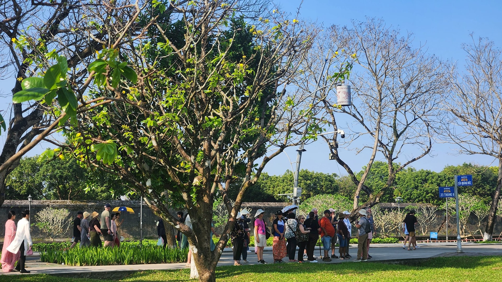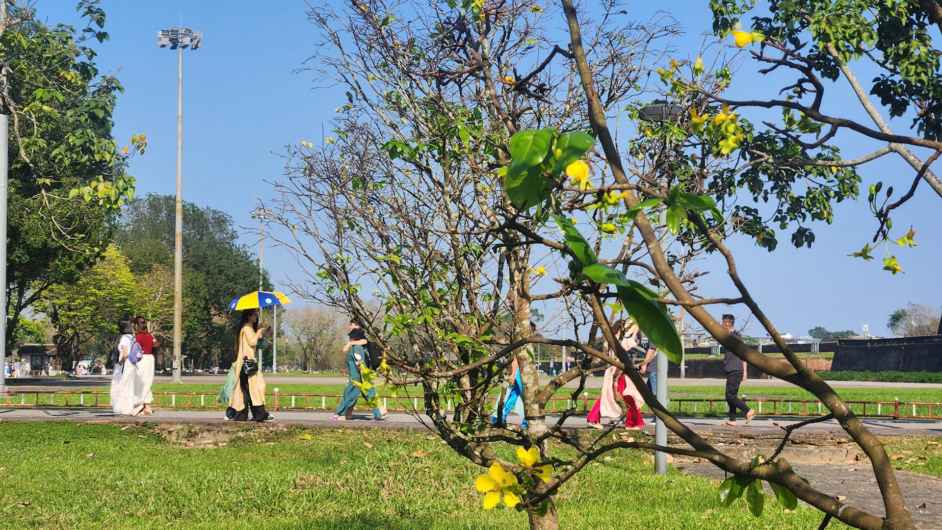 Những ngày này, rất đông người dân và du khách đã tìm đến vườn hoàng mai trước Đại nội Huế để tản bộ, ngắm hoa, ghi lại những khoảnh khắc đẹp trong không gian xuân vừa cổ kính vừa nên thơ. Dưới ánh nắng mùa đông dịu nhẹ, xen giữa những bông mai đã bung nở là những nụ hoa còn e ấp, hứa hẹn khoe sắc rực rỡ đúng vào thời khắc giao mùa thiêng liêng.