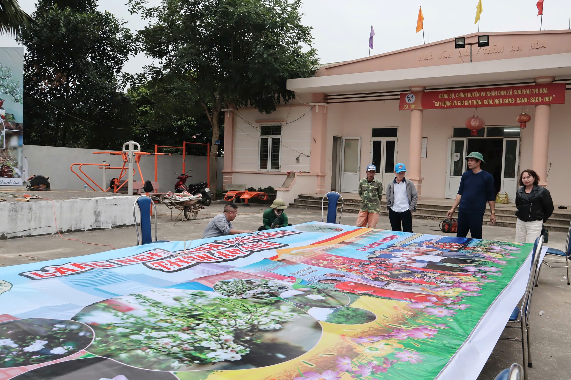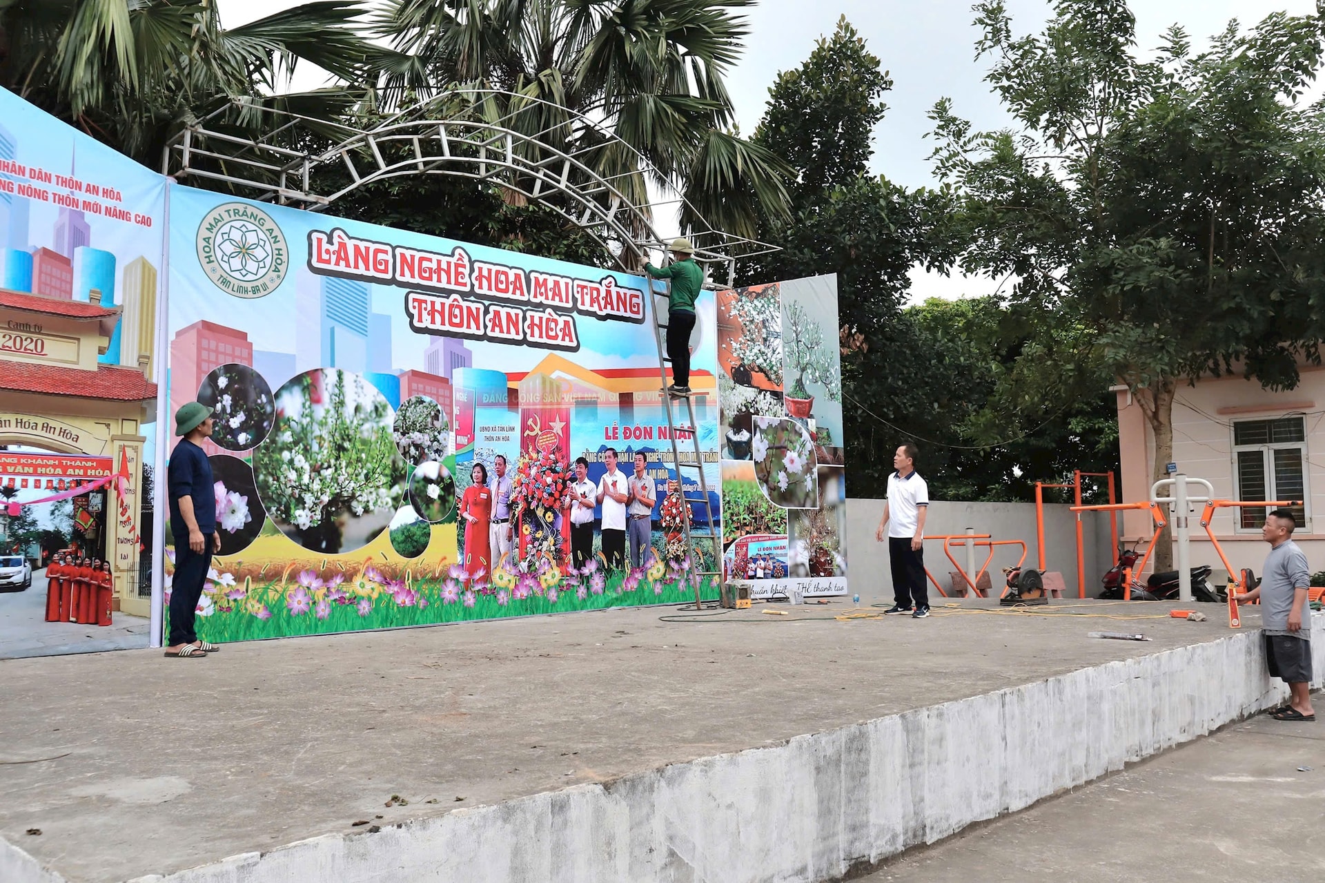 Người dân An Hòa chung sức làm các điểm check in quảng bá nghề trồng mai trắng địa phương. Ảnh: Nguyễn Mai