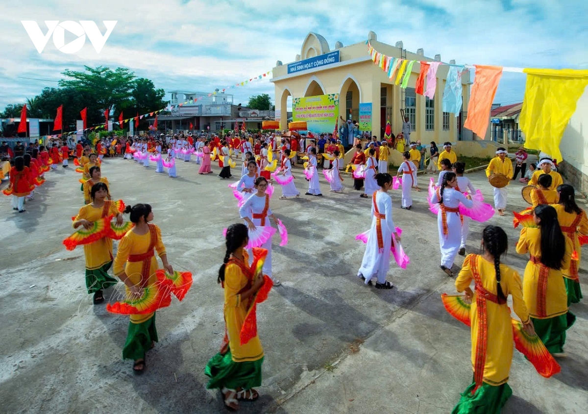 Đội múa rước Y trang Pô Nit bắt đầu tại Nhà sinh hoạt cộng đồng thôn Bình Hiếu, xã Bắc Bình