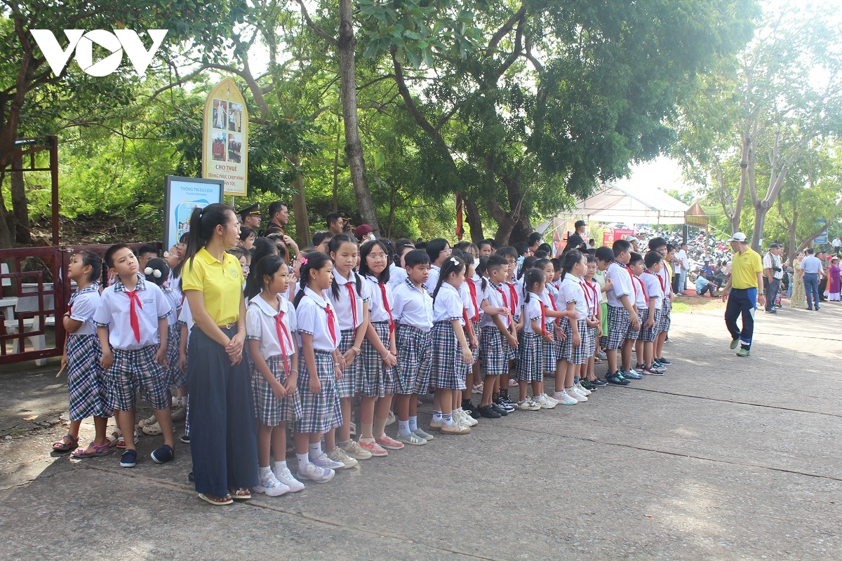 Các em học sinh chuẩn bị lên tháp Pô Sah Inư để xem Lễ hội Katê