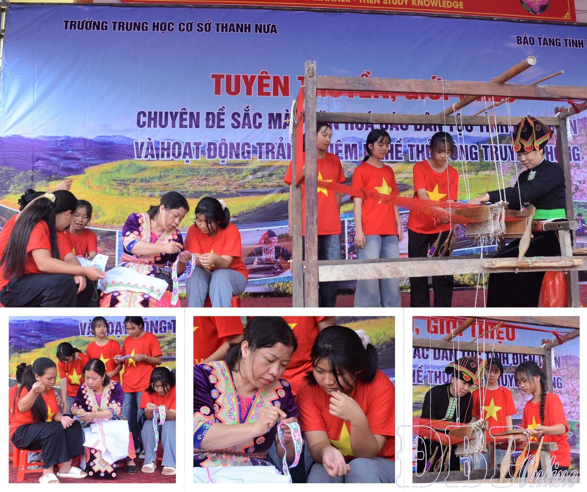 Với địa bàn Thanh Nưa, Bảo tàng tỉnh mời 2 nghệ nhân Thào Thị Di (dân tộc Mông) và Vì Thị Phong (dân tộc Thái) tới giới thiệu, hướng dẫn các em học sinh thực hành nghề thủ công thêu hoa văn truyền thống dân tộc Mông và dệt vải truyền thống dân tộc Thái. Khung cửi dệt vải được đặt giữa sân trường khiến nhiều học sinh tò mò và thích thú trải nghiệm.