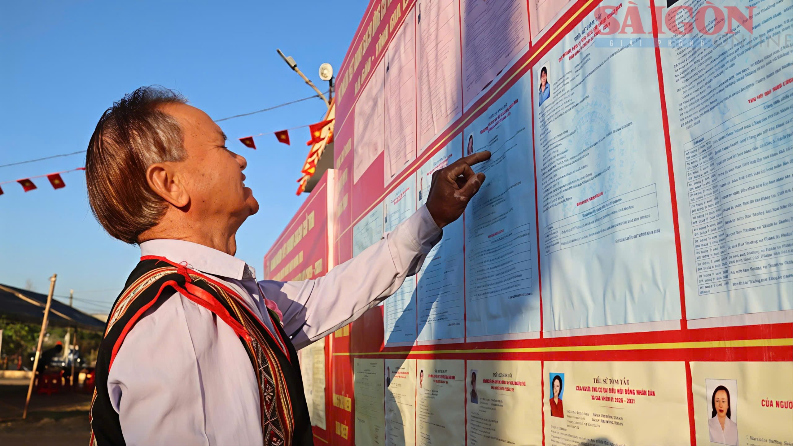 Nhiều cử tri Jrai ở làng C mặc trang phục truyền thống, có mặt tại điểm bầu cử để tìm hiểu thông tin về các ứng cử viên để cân nhắc, chọn người xứng đáng đại diện cho ý chí và nguyện vọng của nhân dân.