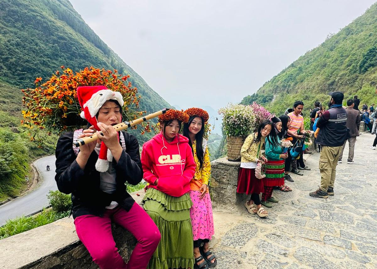 Các em nhỏ hồn nhiên gùi hoa, thổi sáo chào đón khách du lịch tại đèo Thẩm Mã, xã Phố Bảng.