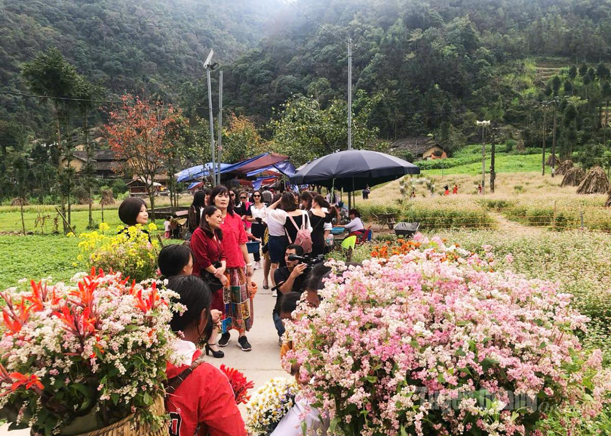 Khách du lịch trải nghiệm, check in tại cánh đồng hoa tam giác mạch, làng văn hóa du lịch Lũng Cẩm.