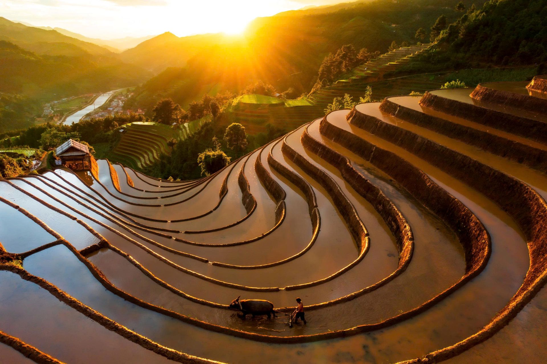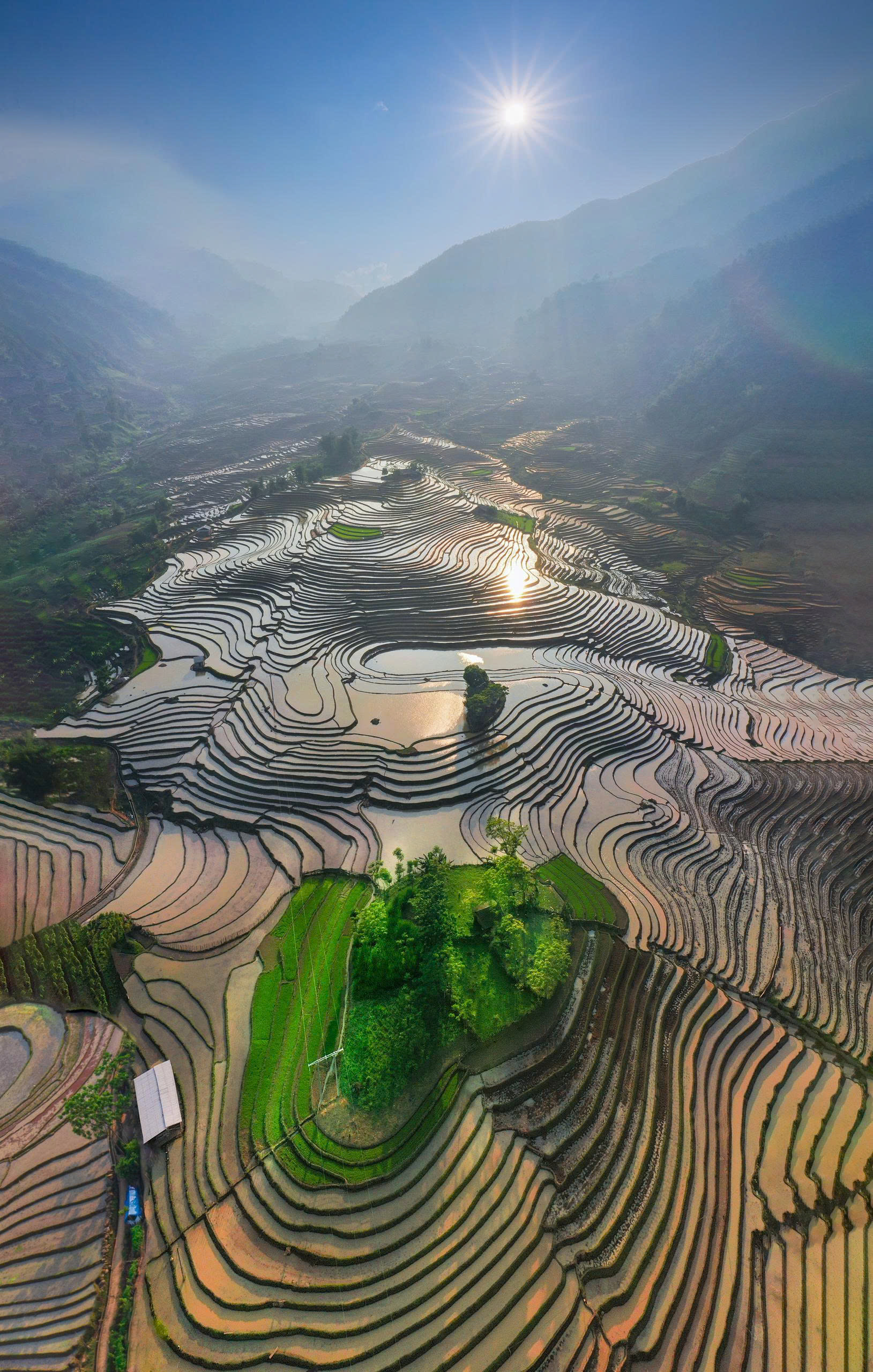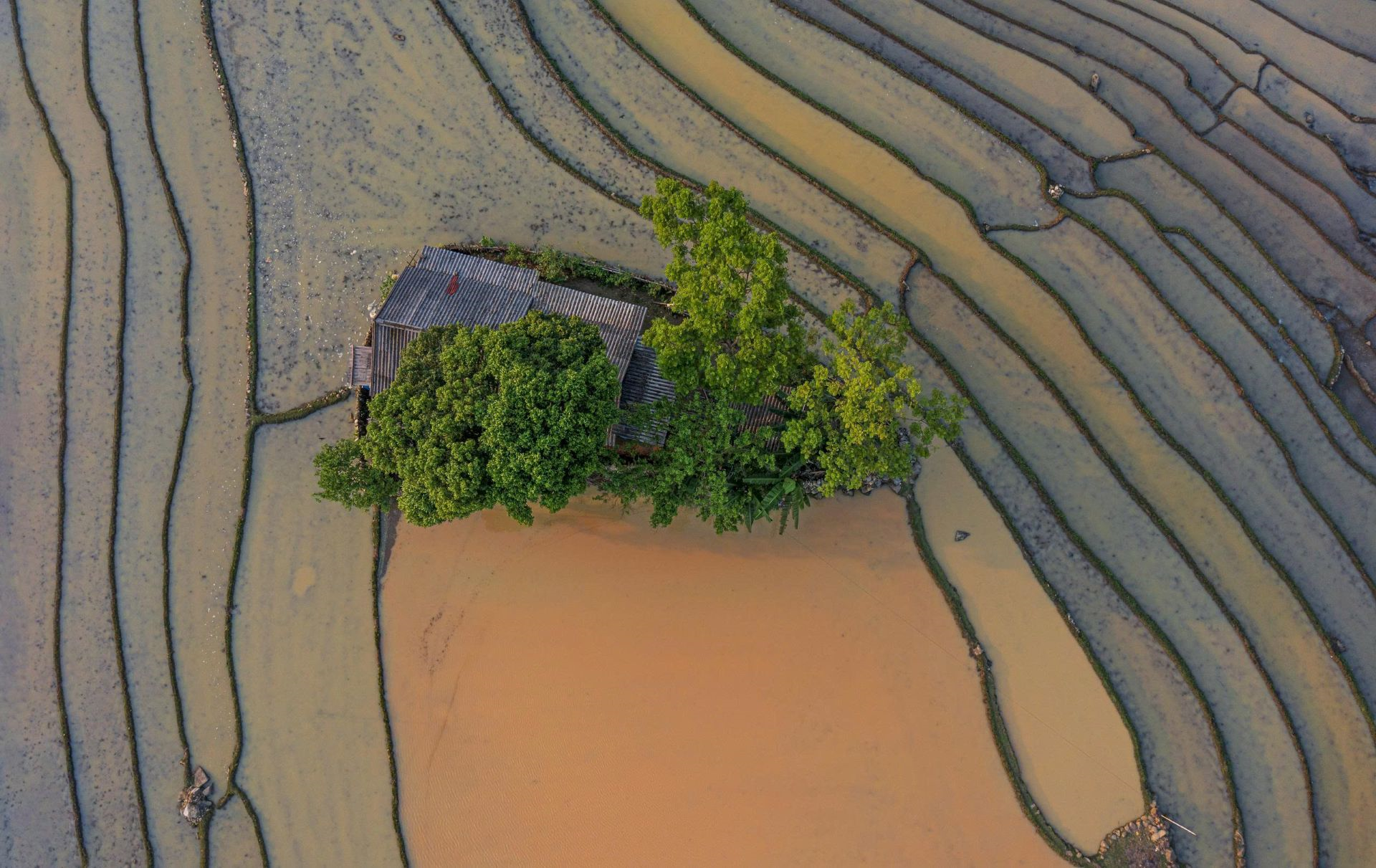 Từ trên cao nhìn xuống, từng đường cong uốn lượn như vân tay của núi, xếp lớp mềm mại, vừa hùng vĩ vừa tinh tế. Nước không chỉ mang phù sa, mà còn mang theo cả nhịp sống, bởi đó là dấu hiệu người nông dân lại bước vào mùa vụ mới, lặng lẽ gieo những mầm xanh đầu tiên.