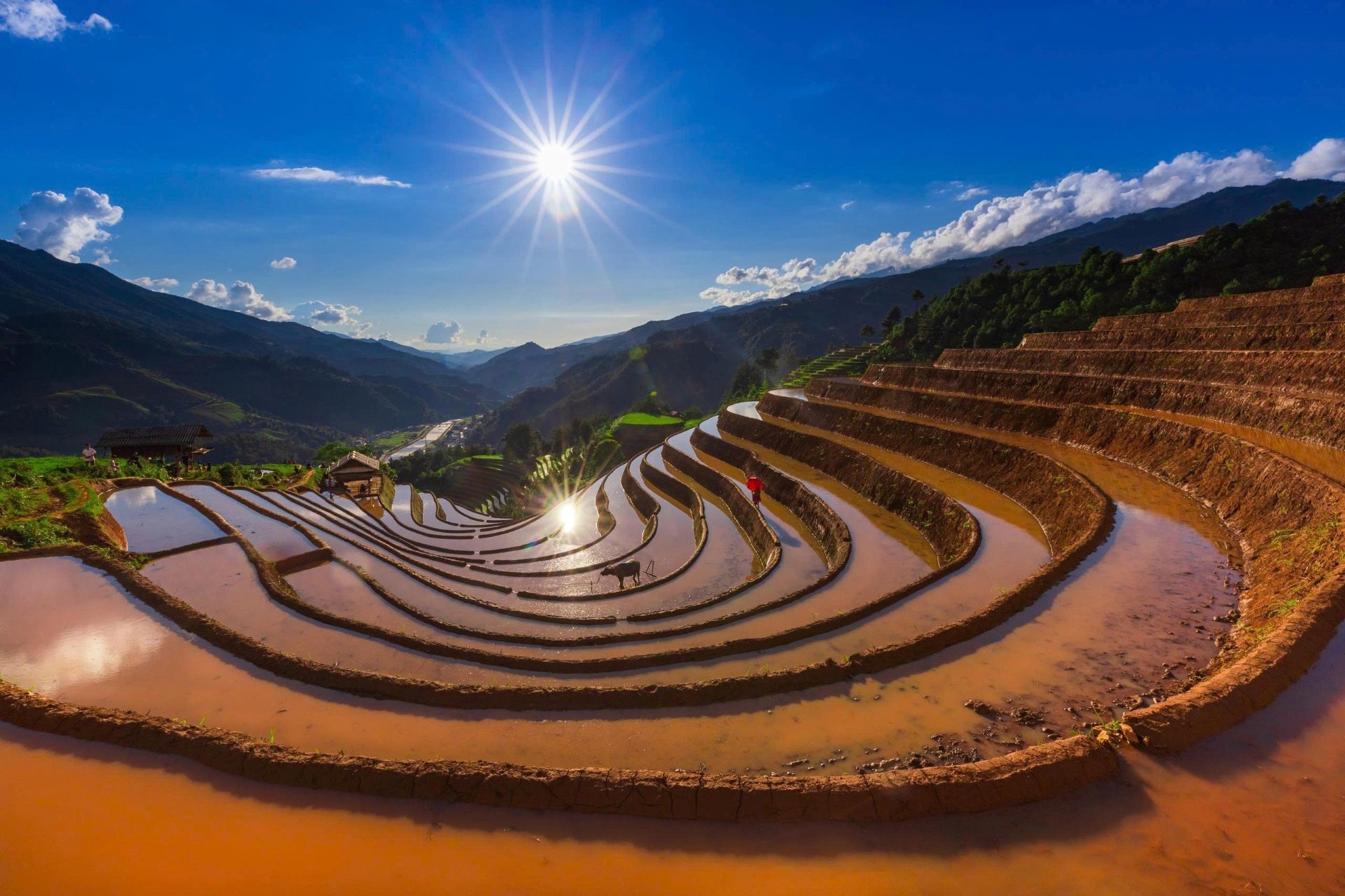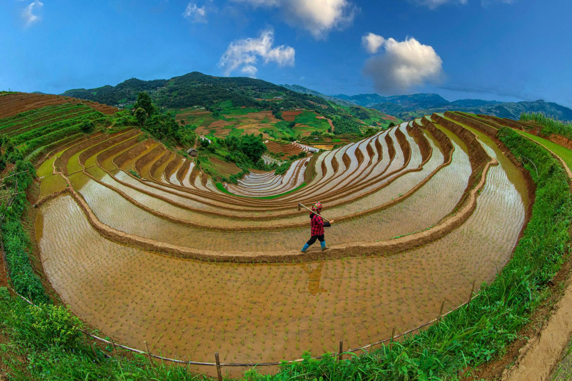 Người nông dân bước giữa những thửa ruộng bậc thang vừa dẫn nước, mặt ruộng ánh lên sắc nâu đỏ của đất mới.