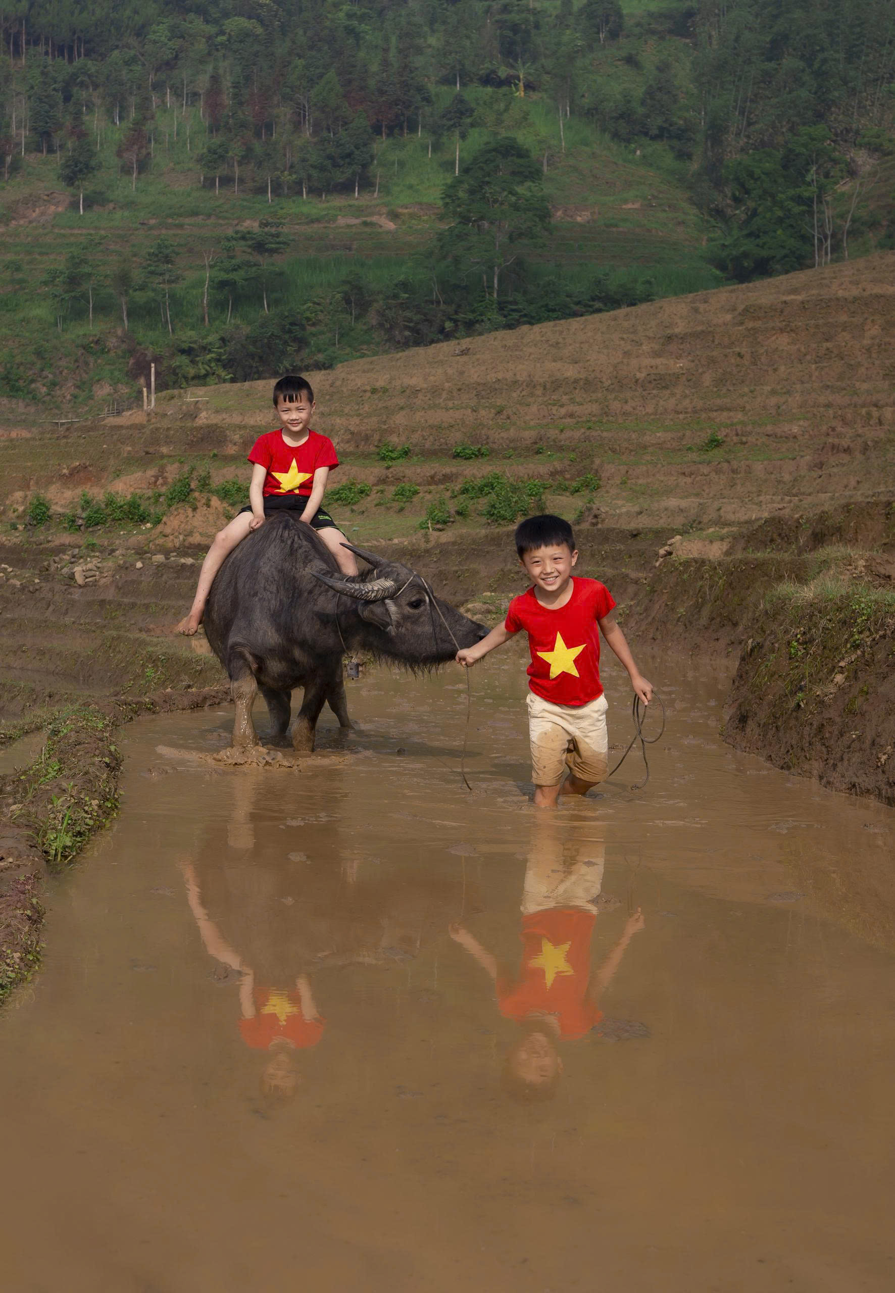 Hai em nhỏ dắt trâu giữa ruộng nước, nụ cười hồn nhiên phản chiếu trên mặt bùn, gợi lên nhịp sống yên bình nơi miền núi.
