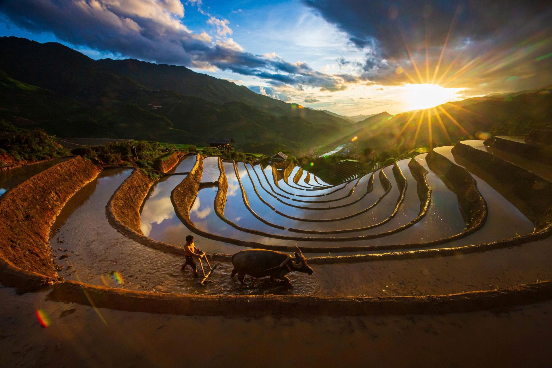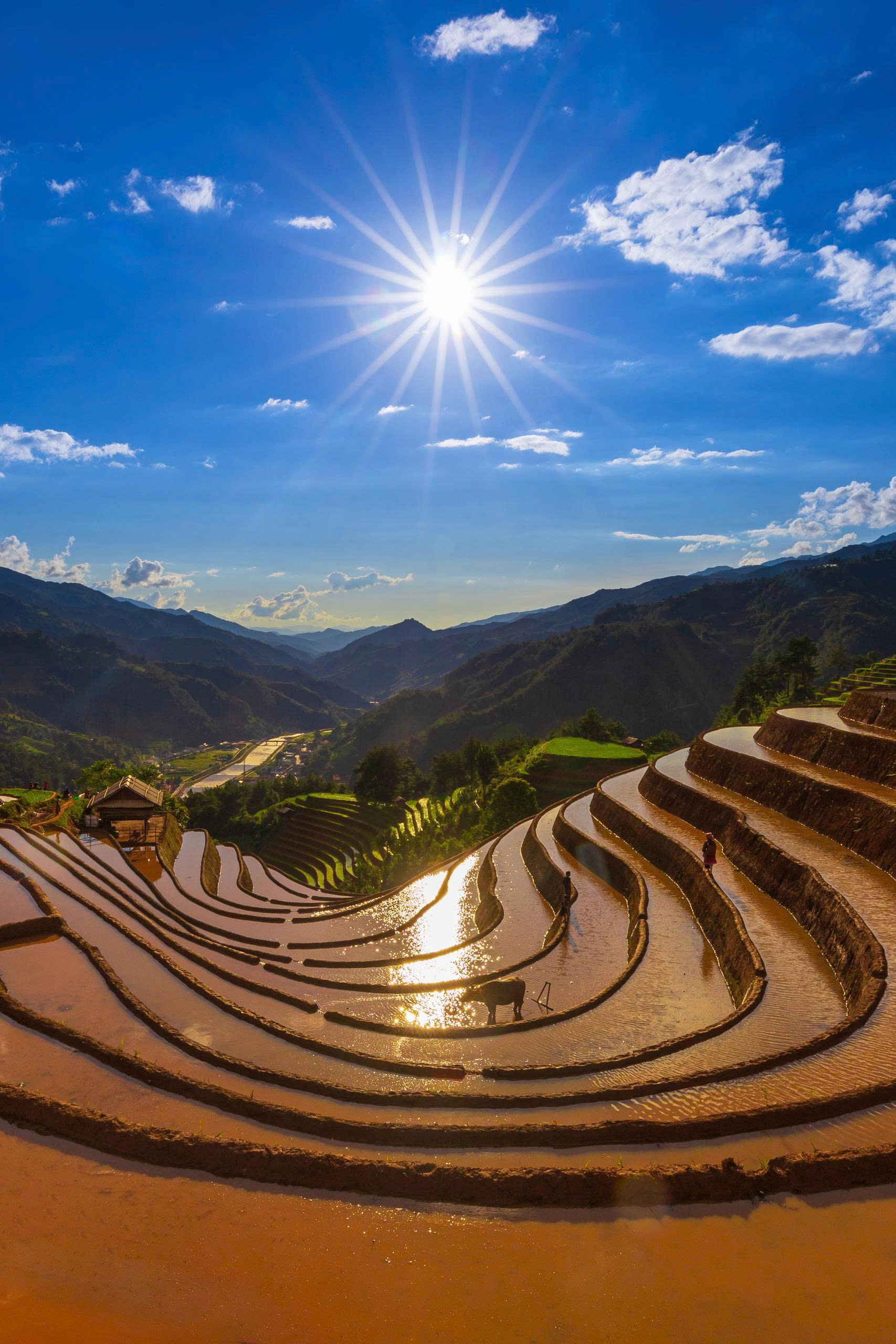 Bình minh phủ sương lên thung lũng, ruộng bậc thang loang ánh bạc như những tấm gương khổng lồ chiều ánh mặt trời.