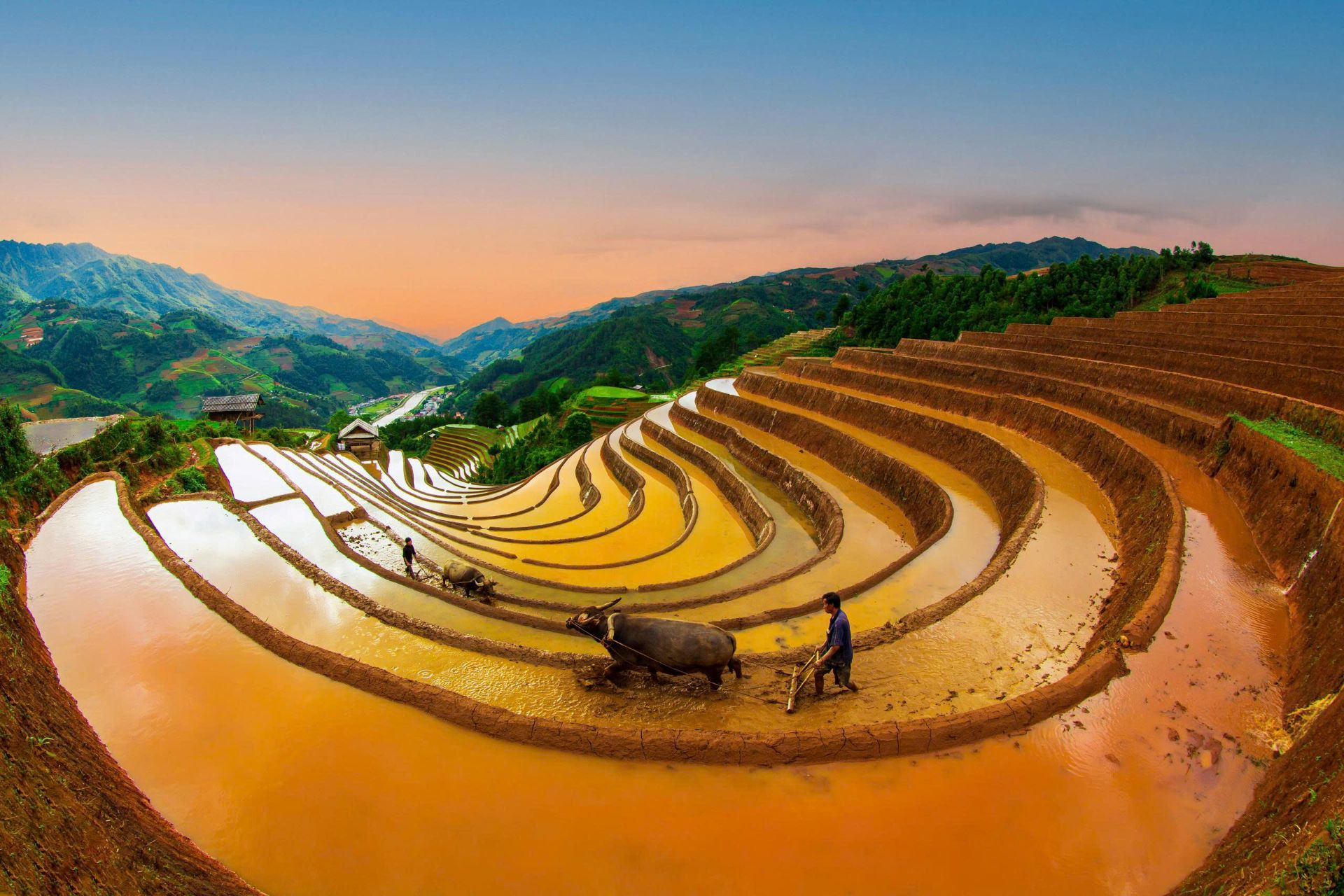 Buổi chiều nhuộm vàng sườn núi, nước đổ đầy từng bậc ruộng, tạo nên những lớp màu ấm áp và sâu lắng.