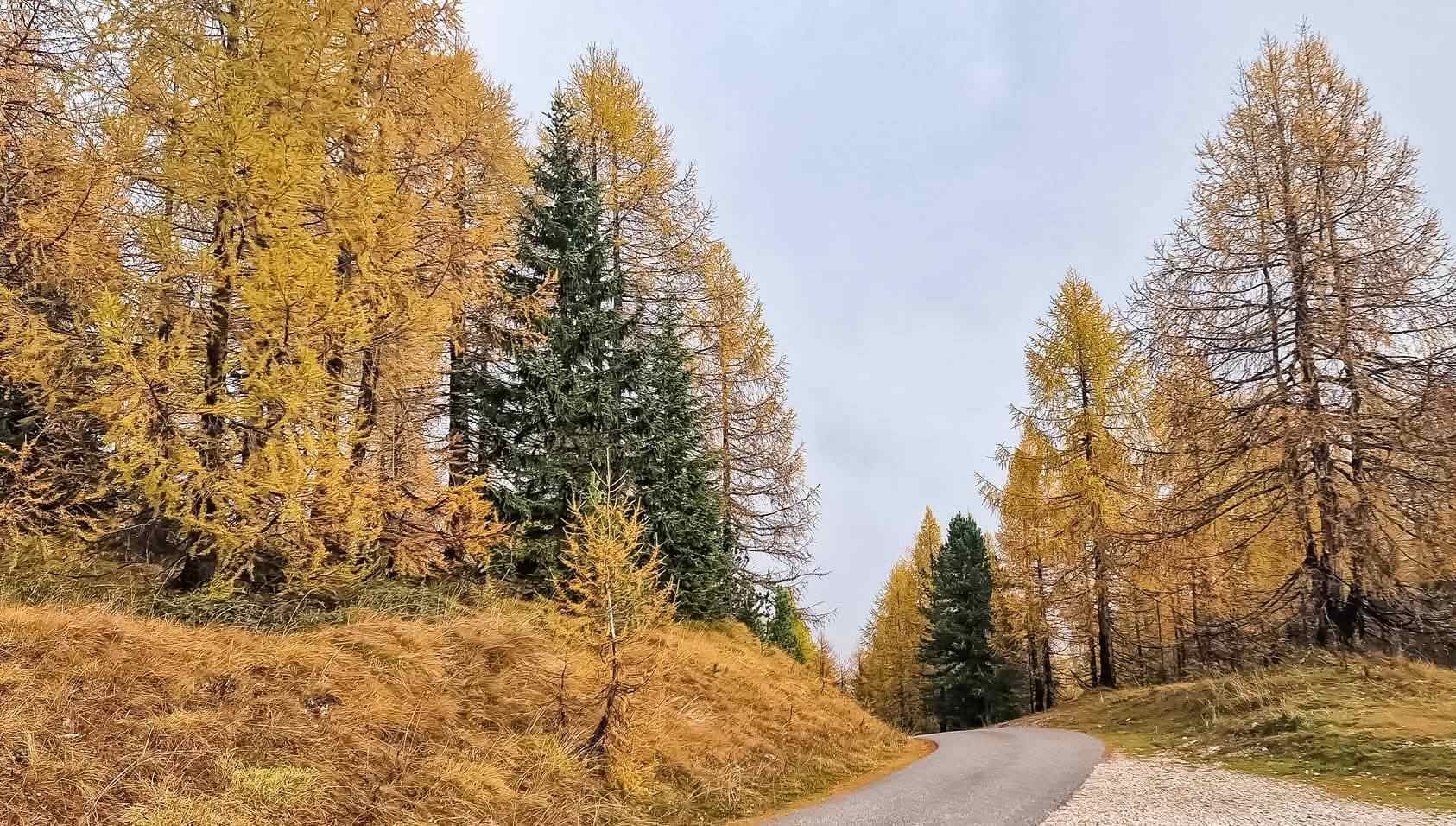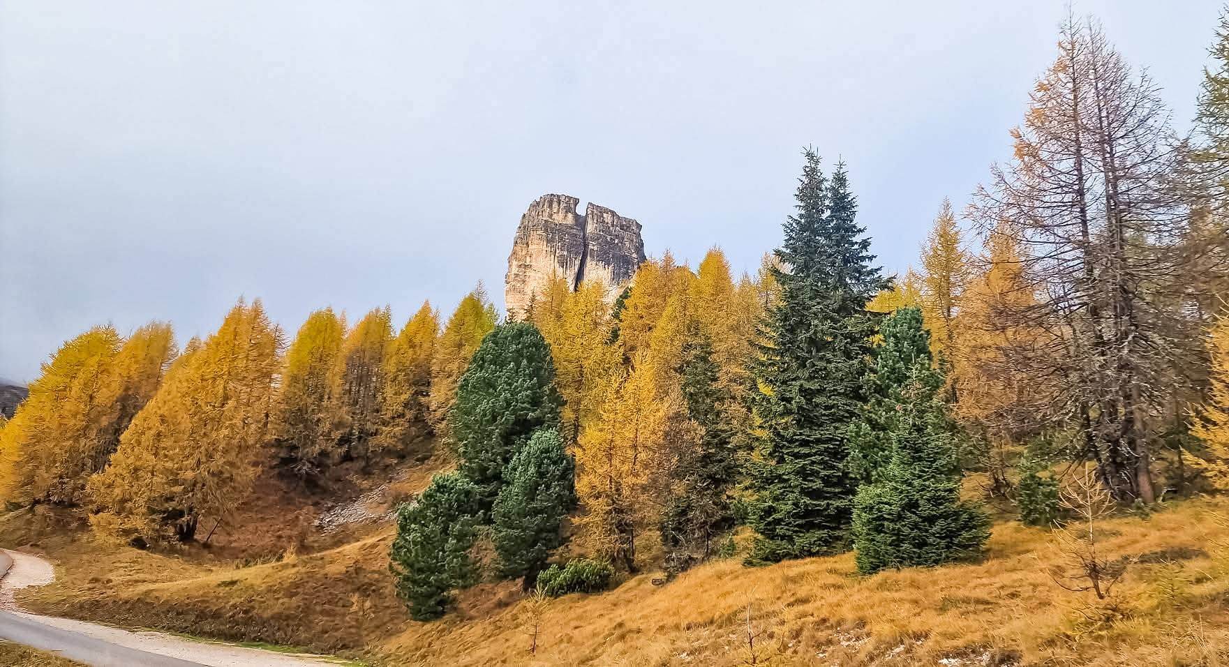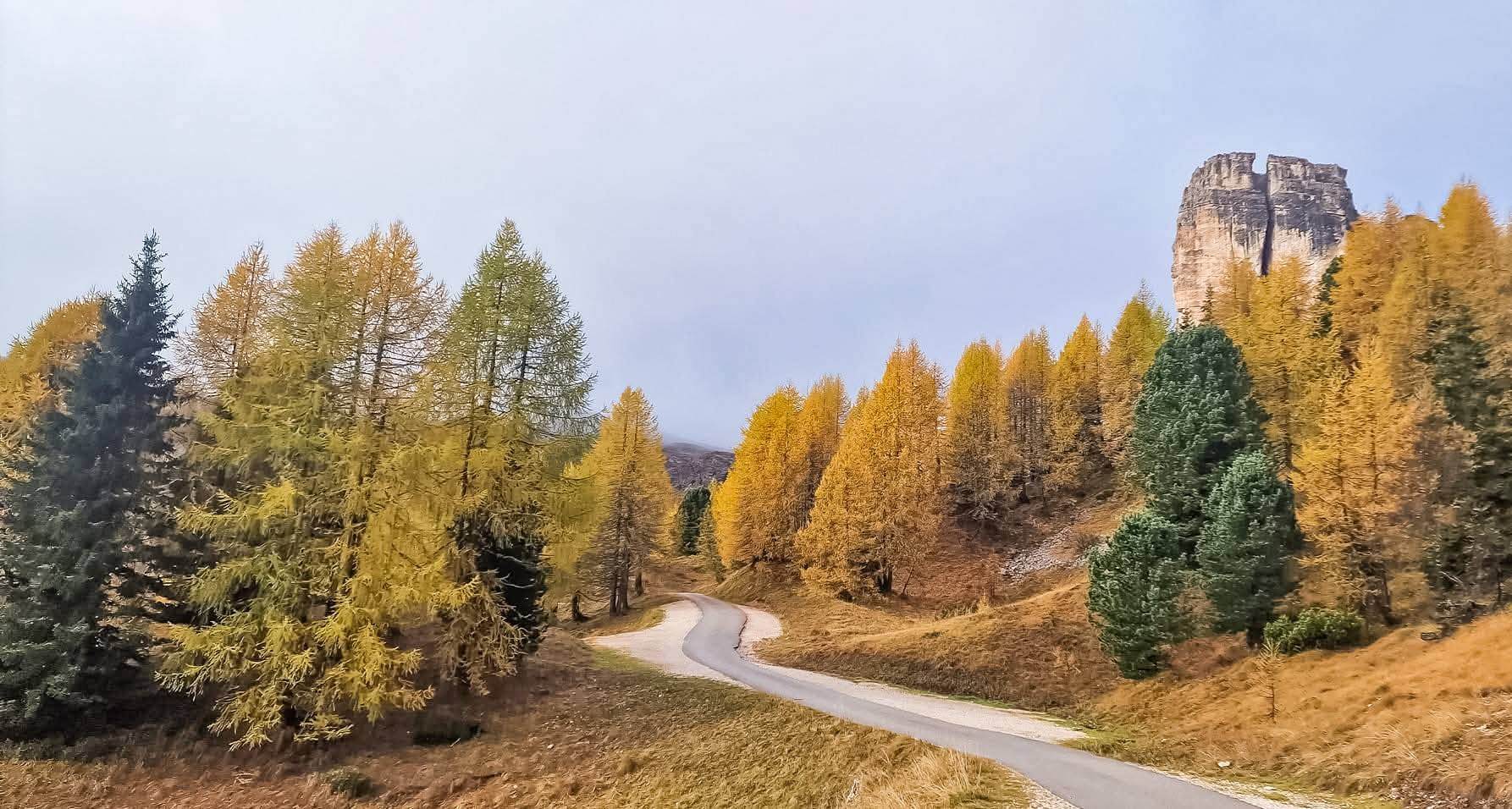 Con đường dẫn vào Cinque Torri uốn lượn giữa rừng cây đang chuyển sắc. Lá rụng phủ dày trên lối đi, tạo thành lớp thảm vàng đặc trưng của vùng núi phía Bắc nước Ý trong tháng 10. Ảnh: Nguyễn Tất Thịnh