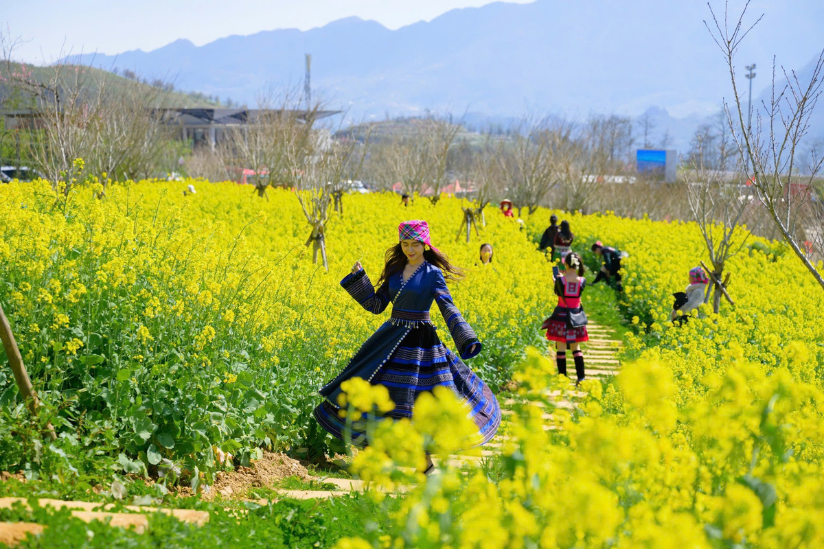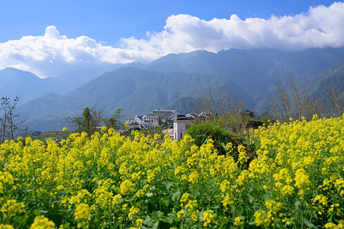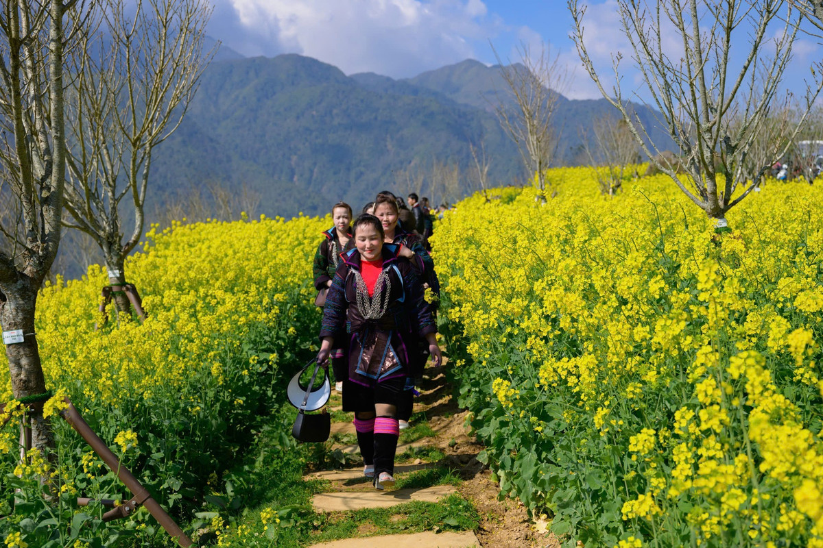 Mùa hoa cải không chỉ làm đẹp thiên nhiên mà còn khiến nhịp sống bản làng rộn ràng hơn. Từ sáng sớm, du khách đã đổ về các triền hoa dưới chân Fansipan để dạo chơi, chụp ảnh, tận hưởng không khí xuân vùng cao. Ảnh Nguyễn Hoàng