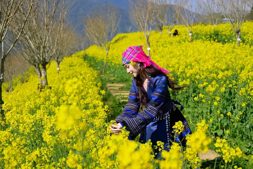 Giữa biển hoa, hình ảnh những cô gái trong trang phục dân tộc rực rỡ trở thành điểm nhấn đầy thi vị. Khăn đội đầu sắc màu, váy thổ cẩm uyển chuyển giữa sắc vàng hoa cải khiến khung cảnh như bước ra từ một bức tranh vùng cao. Ảnh Nguyễn Hoàng