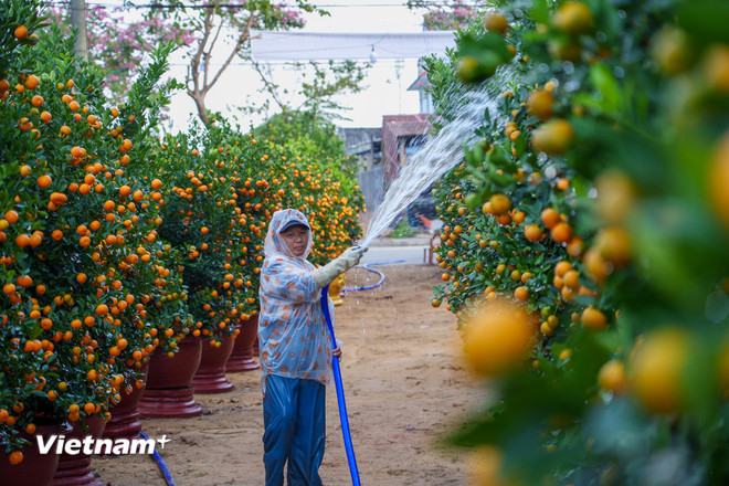 Những chậu quất cao lớn vẫn luôn được người dân chăm sóc kỹ lưỡng hàng ngày, đảm bảo chất lượng cây quất cảnh luôn mang sắc xuân tươi mới đến mọi nhà. (Ảnh: Thanh Phong/Vietnam+)