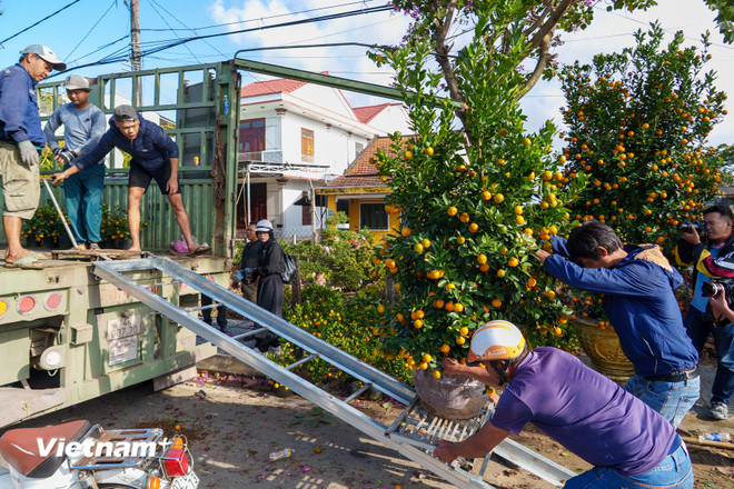 Trên tuyến đường trục chính nối trung tâm Đà Nẵng và phố cổ Hội An, từng đoàn xe tải của thương lái nối đuôi nhau dừng, đỗ chuẩn bị chuyên chở quất cho các thương lái từ khắp nơi đến đây thu mua. Tạo nên nhịp tất bật, hối hả của một mùa vụ quất cảnh Tết sôi động mang theo nhiều niềm vui cho nhân dân trồng quất.
