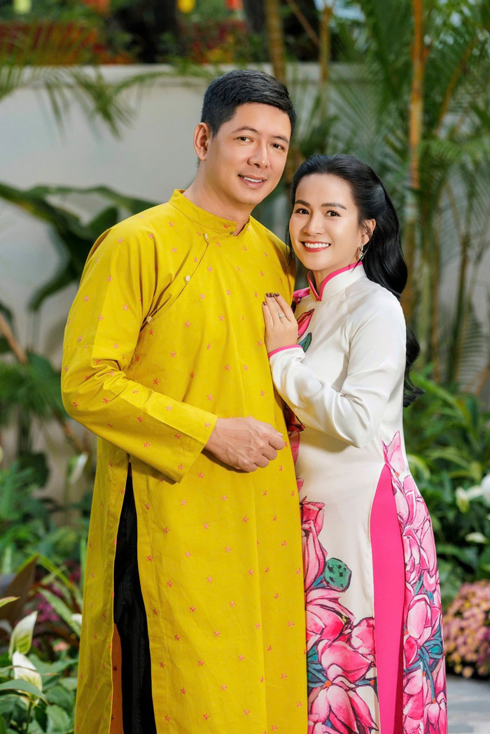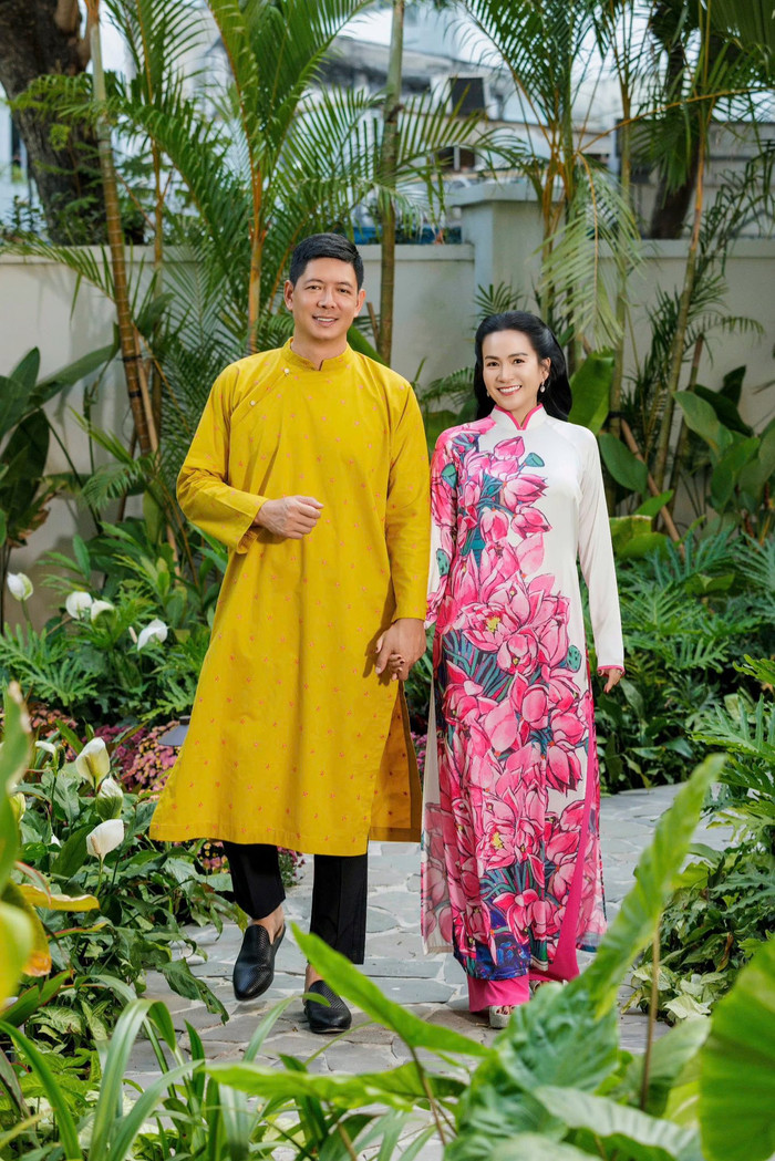 Trong loạt ảnh được đăng tải, Bình Minh lựa chọn trang phục truyền thống với áo dài tông vàng nổi bật, kết hợp kiểu dáng tối giản. Anh xuất hiện với thần thái điềm đạm, nụ cười nhẹ nhàng, tạo cảm giác gần gũi. Vợ Bình Minh cũng diện áo dài với họa tiết hoa, mang đến hình ảnh hài hòa và trang nhã. Cách tạo dáng tự nhiên, không cầu kỳ giúp bộ ảnh giữ được tinh thần đời thường, gần gũi.
