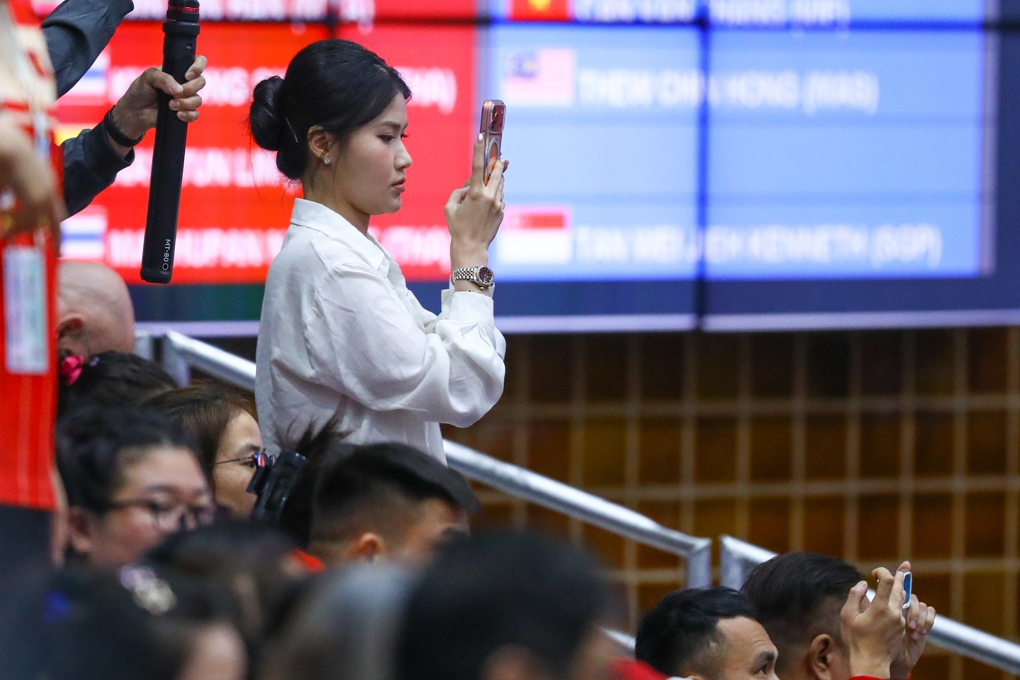 Trong những ngày Hồng Sơn thi đấu tại SEA Games 33, Mai Hương có mặt từ rất sớm. Ngay cả khi chồng đã kết thúc phần thi, cô vẫn nán lại quay phim, động viên các VĐV khác. Ảnh: Minh Chiến.