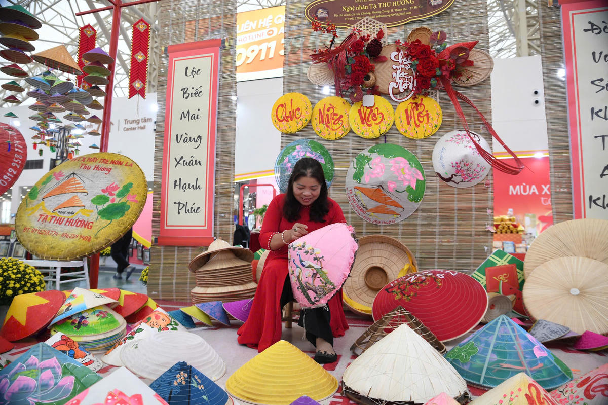 Nghệ nhân tái hiện các khâu làm nón ngay tại hội chợ. Ảnh: Phạm Sỹ.