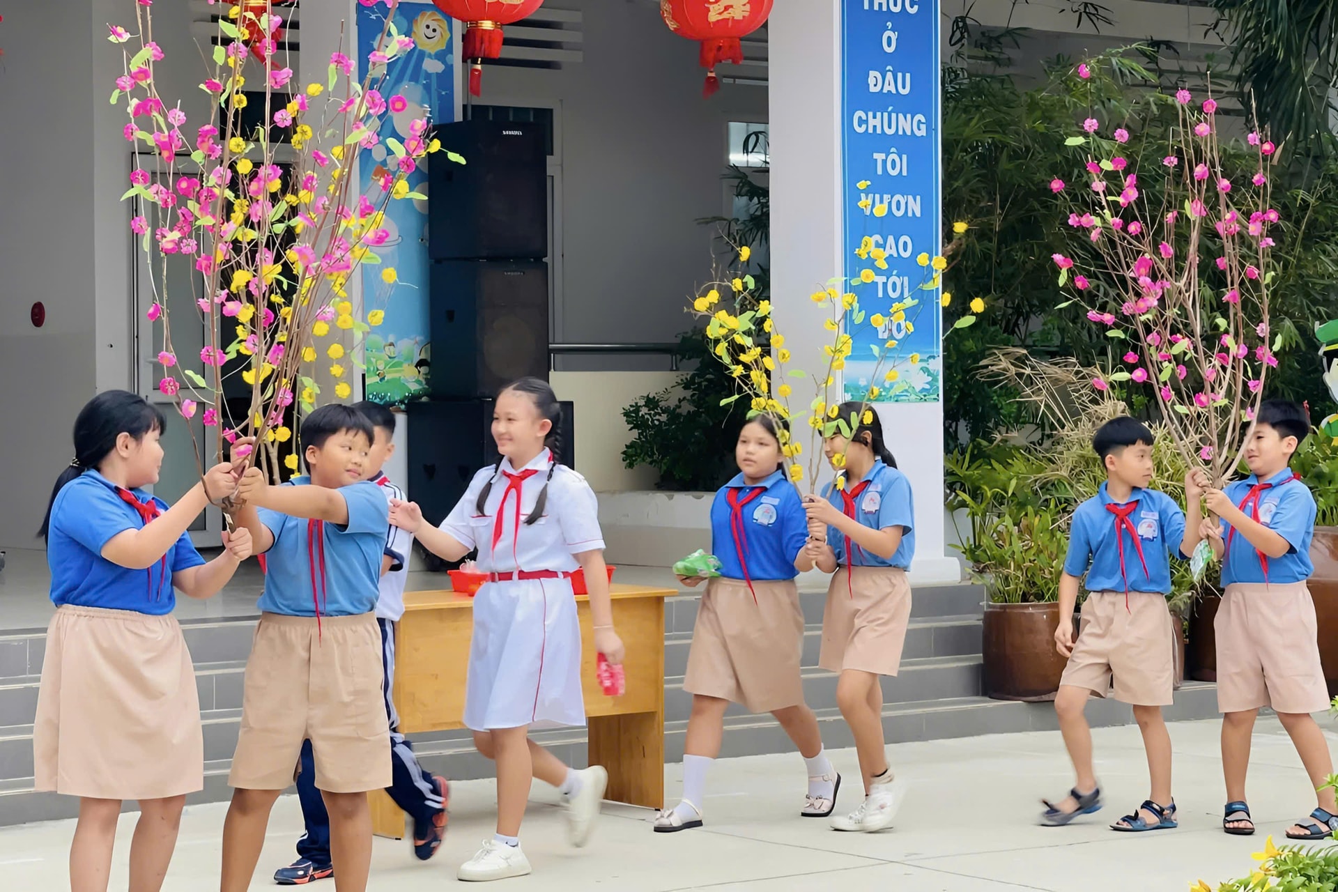 Học sinh Trường Tiểu học Mũi Né 3, phường Mũi Né trang trí hoa mai, hoa đào vui Xuân đón Tết