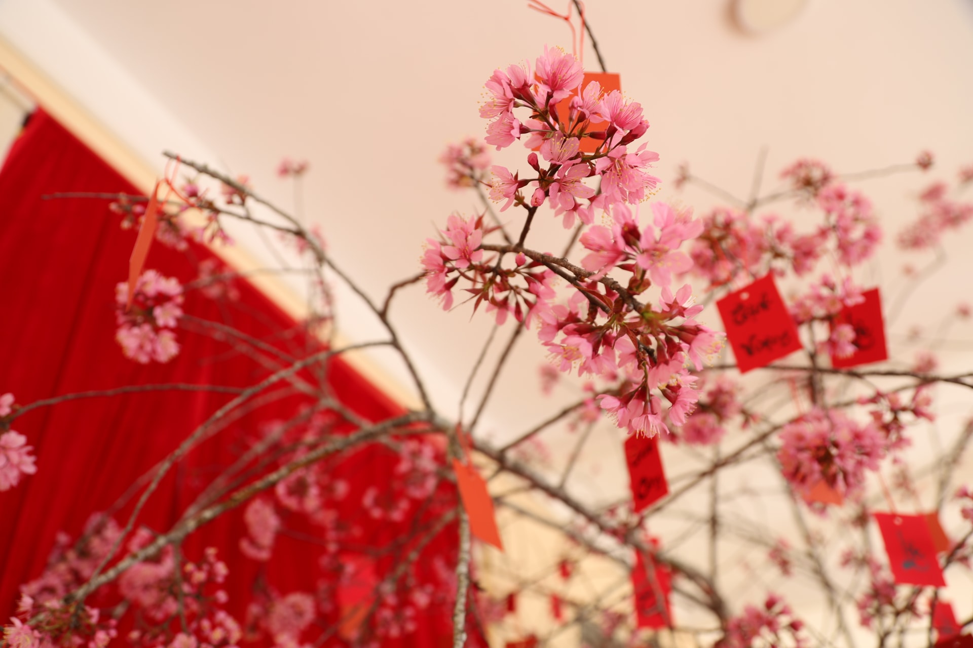 Những cành hoa, dây trang trí được tô điểm tạo nên sắc xuân tại Trường Tiểu học Bạch Đằng, phường Lang Biang - Đà Lạt