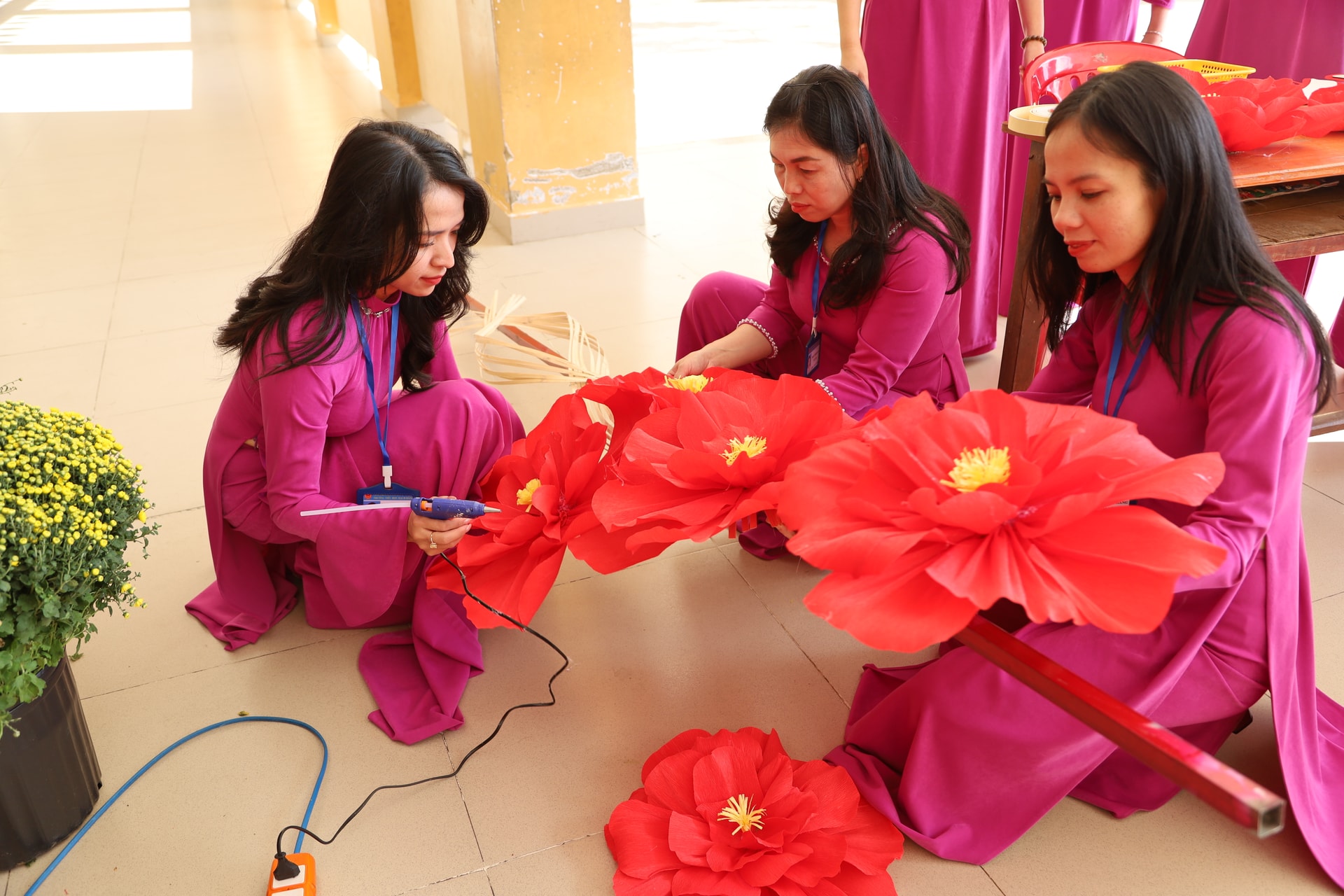 Các cô giáo khéo léo làm bông hoa, vật trang trí tại Trường Tiểu học Bạch Đằng, phường Lang Biang - Đà Lạt