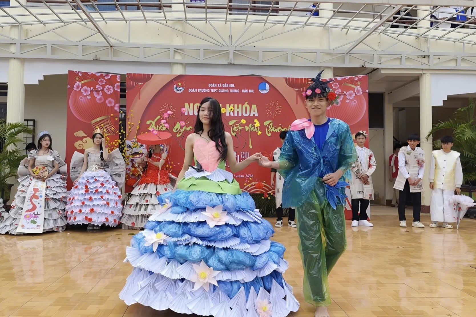 Trường THPT Quang Trung - Đắk Mil, xã Đắk Mil tổ chức trình diễn thời trang tái chế chủ đề "Hương sắc mùa Xuân"