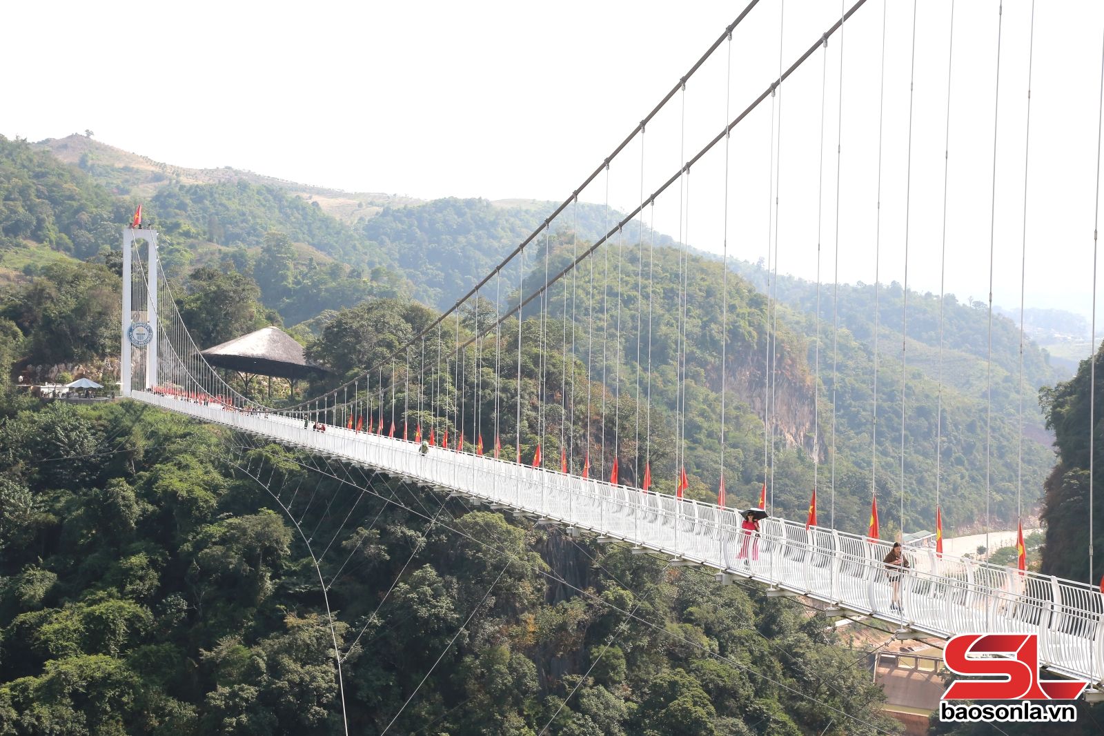 Du khách trải nghiệm Cầu kính Bạch Long, Khu du lịch Mộc Châu Island, phường Mộc Châu.