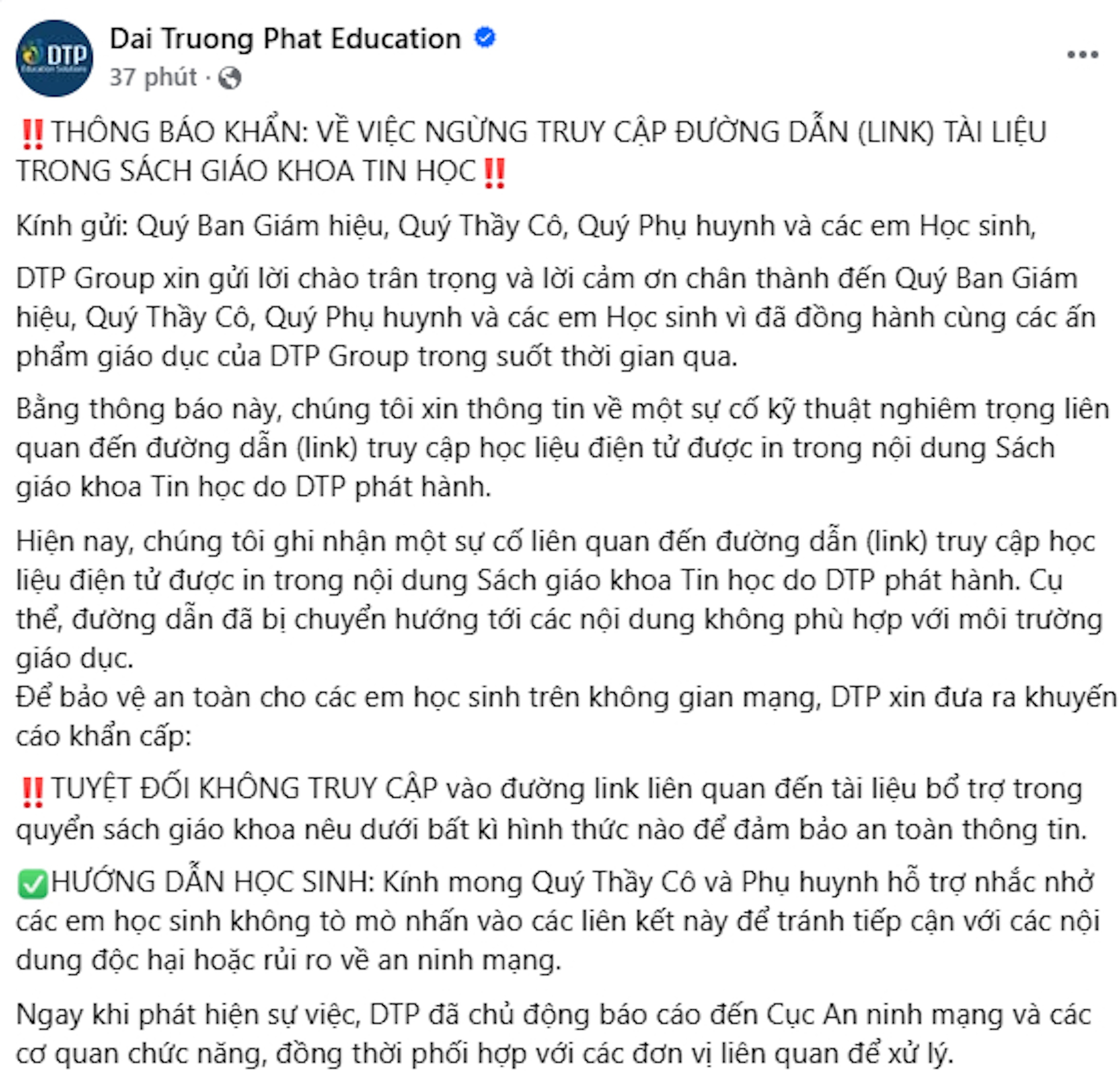 Mong nhận được sự thấu hiểu và đồng hành từ quý thầy cô, phụ huynh và các học sinh. DTP chân thành xin lỗi vì sự bất tiện và cam kết không ngừng nâng cao chất lượng, đảm bảo an toàn cho các sản phẩm giáo dục trong thời gian tới...", Tập đoàn Đại Trường Phát viết trên bài đăng trên Fanpage.