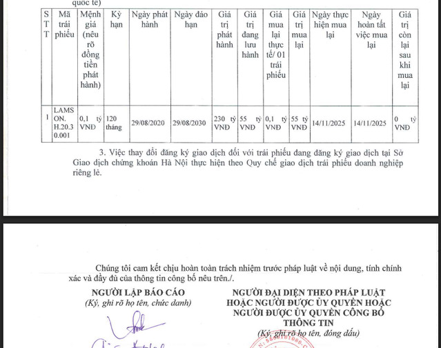 Đến ngày 14/11/2025, Xây dựng và Thương mại Lam Sơn tiếp tụcthanh toán 55 tỷ đồng tiền gốc; qua đó tất toán xong lô trái phiếu này.