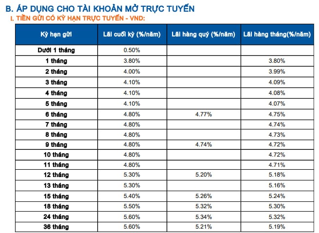 Bên cạnh đó, ngân hàng cũng tiến hành điều chỉnh tăng nhẹ lãi suất tiền gửi trực tuyến đối với các kỳ hạn ngắn từ 1 đến 5 tháng, với cùng mức tăng 0,2 điểm phần trăm mỗi kỳ hạn. Hiện lãi suất tiết kiệm trực tuyến lĩnh lãi cuối kỳ tại kỳ hạn 1 tháng được niêm yết ở mức 3,8%/năm, kỳ hạn 2 tháng là 4%/năm, còn các kỳ hạn 3–5 tháng tăng lên 4,1%/năm.