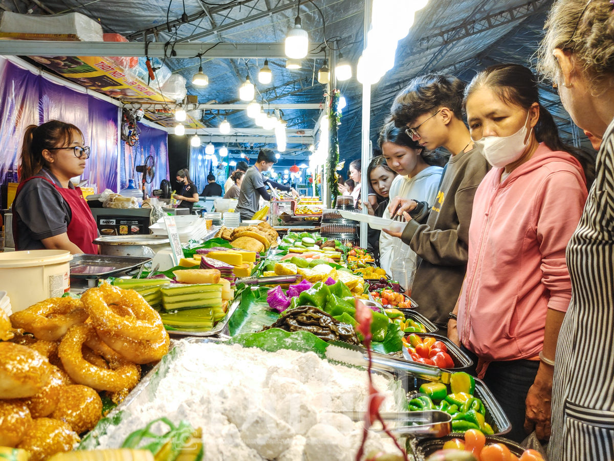 Tại đây, các sạp hàng mộc mạc bày bán đủ đầy những phong vị đặc trưng của ngày Tết truyền thống: từ những hũ dưa hành củ kiệu giòn tan, những khay bánh mứt đủ màu sắc, đến những sạp dưa hấu xanh mướt được dán chữ "Phúc - Lộc - Thọ" đỏ thắm v.v..