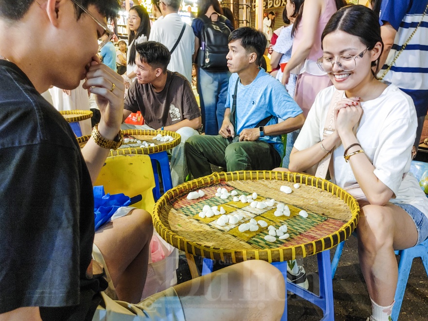Các bậc phụ huynh cùng con em mình chen chân cùng du khách, ngồi đặc kín 2 bên đường đi, thưởng thức từng xâu viên chiên, xúc xích nướng…