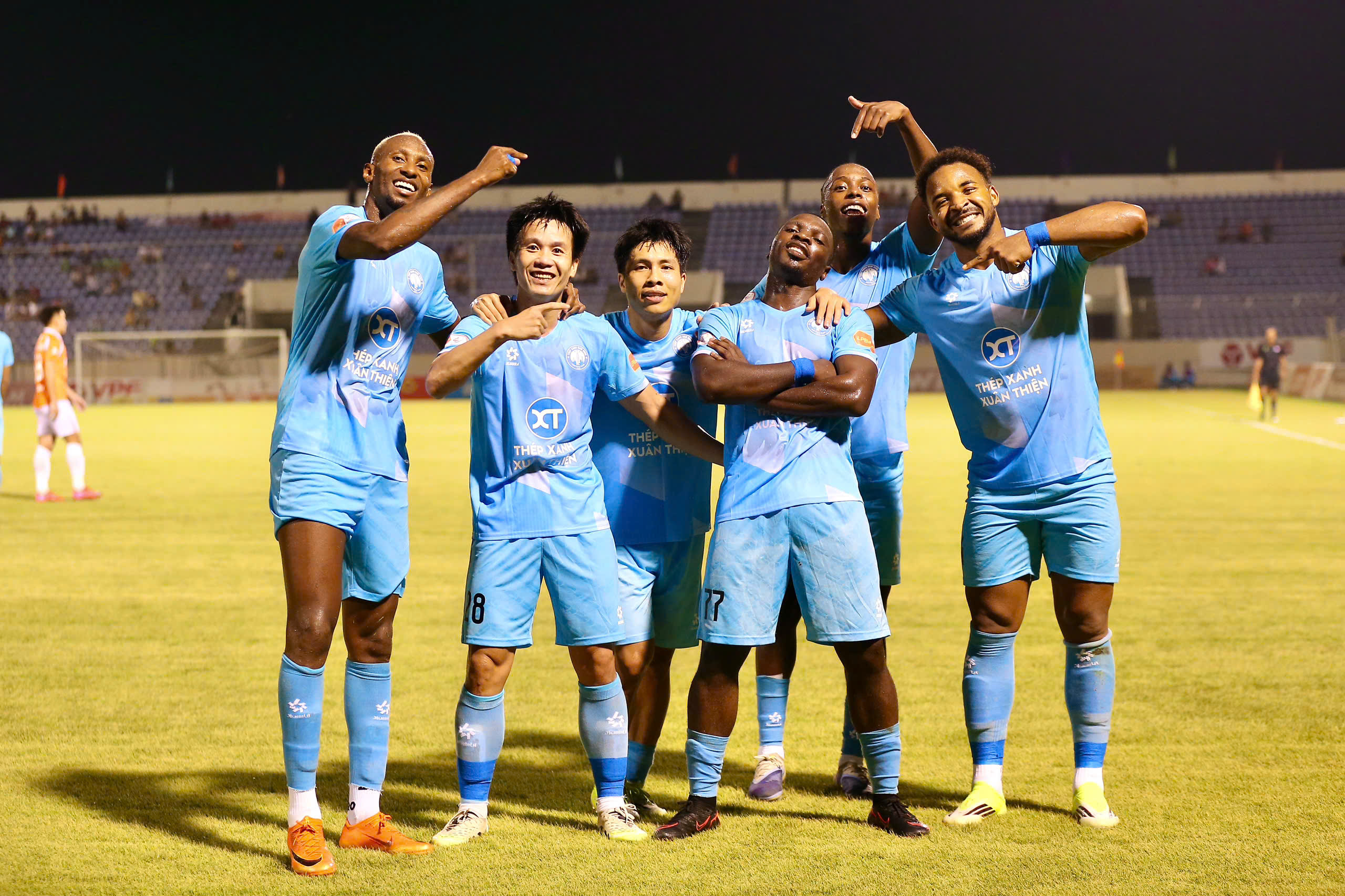 Các cầu thủ Nam Định (áo xanh) giành chiến thắng trên sân Chi Lăng của Đà Nẫng. ẢNH: QUANG ĐƯƠNG