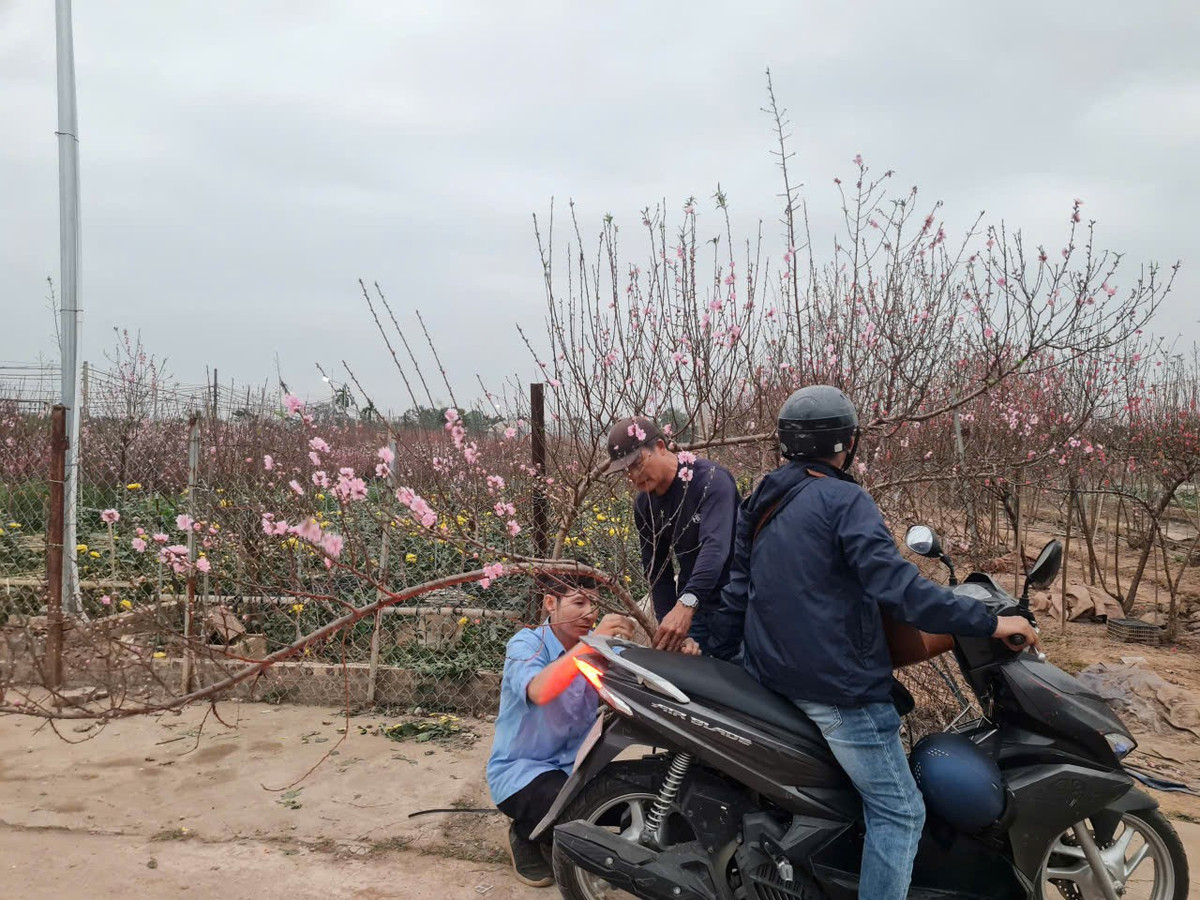 Chủ vườn buộc cành đào cho khách mua mang về. Ảnh: Mai Loan.