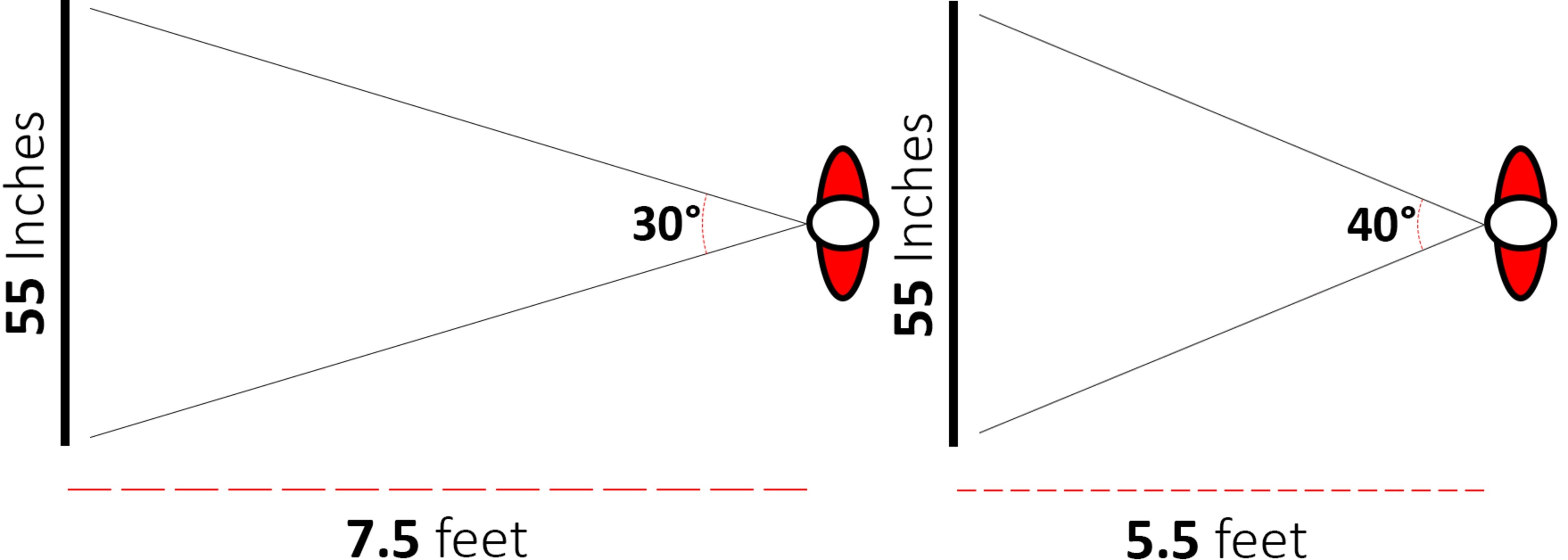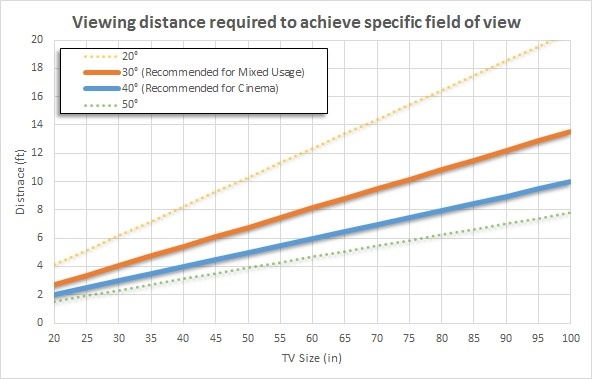 Phạm vi nhìn tối thiểu 30 độ được khuyến nghị bởi Hiệp hội Kỹ sư Điện ảnh và Truyền hình (SMPTE). Đây là chuẩn cơ bản với hầu hết nhu cầu sử dụng, song có thể tinh chỉnh theo sở thích cá nhân. Ví dụ, có thể cân nhắc phạm vi 40 độ nếu muốn trải nghiệm xem phim sống động, hoặc chơi game thiên về cốt truyện.