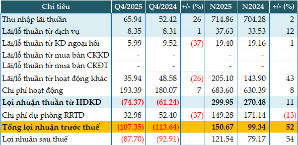 Lũy kế cả năm 2025, Saigonbank ghi nhận lợi nhuận thuần từ hoạt động kinh doanh gần 300 tỷ đồng, tăng 11% so với năm trước. Ngân hàng trích lập hơn 149 tỷ đồng dự phòng rủi ro tín dụng, giảm 13%, qua đó giúp lợi nhuận trước thuế đạt gần 151 tỷ đồng, tăng 52% so với năm 2024.