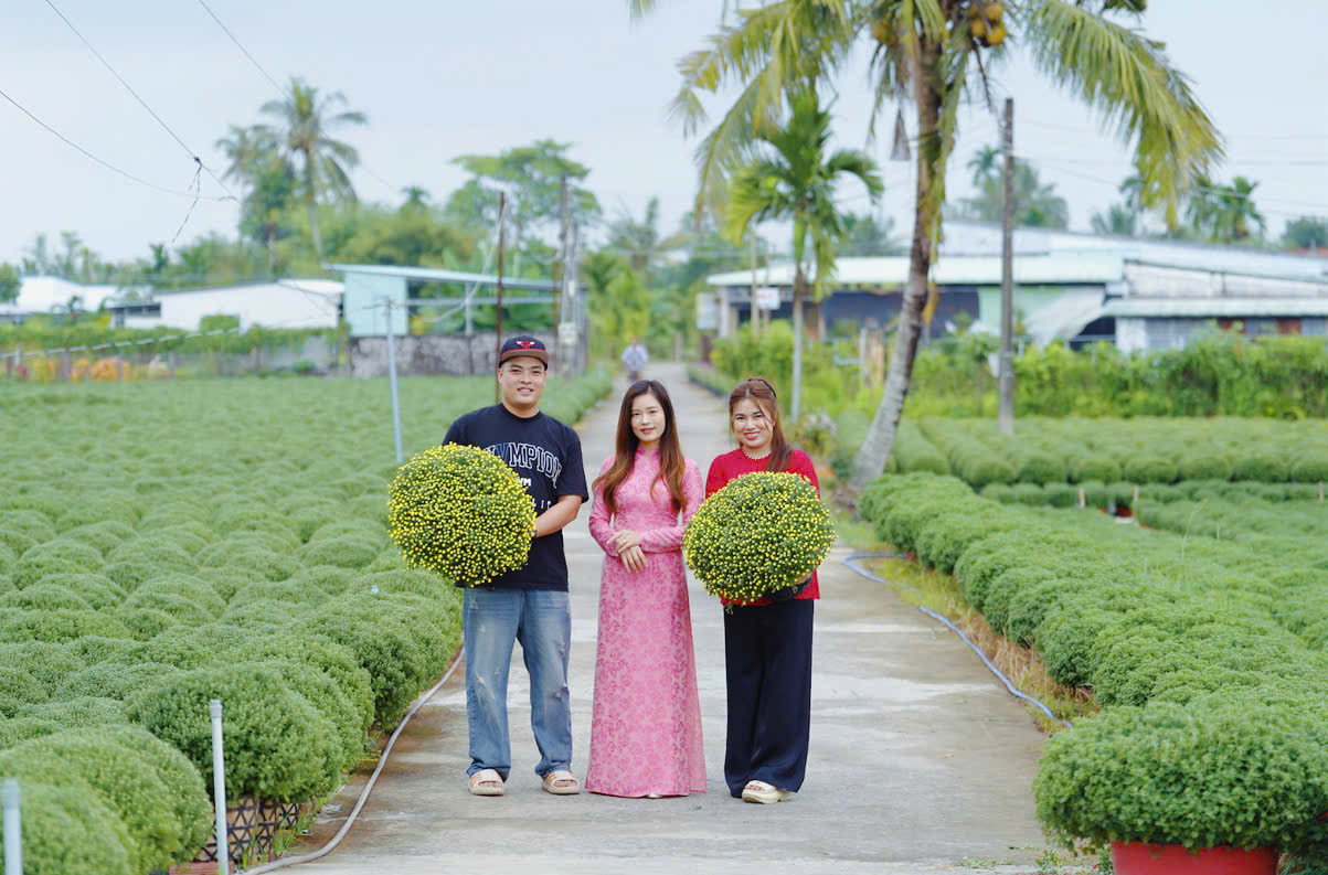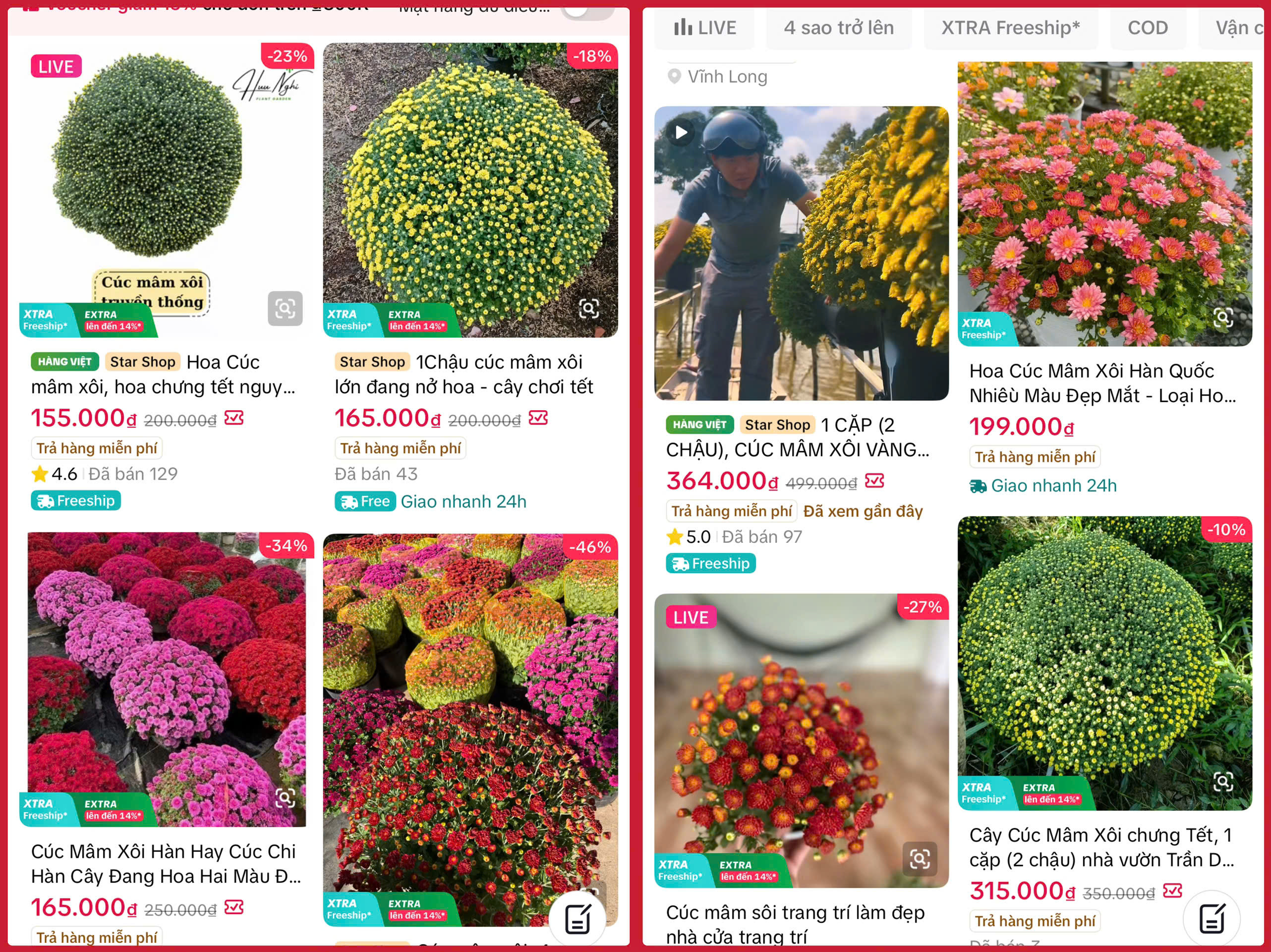 Tại Vĩnh Long, chị Hồ Thị Mộng Thơ (chủ vựa cây giống Huyền Linh) cho biết năm nay chị chuẩn bị sẵn 30.000 chậu cúc mâm xôi phục vụ thị trường Tết. Đây là năm thứ hai chị tham gia bán hoa trên nền tảng số.