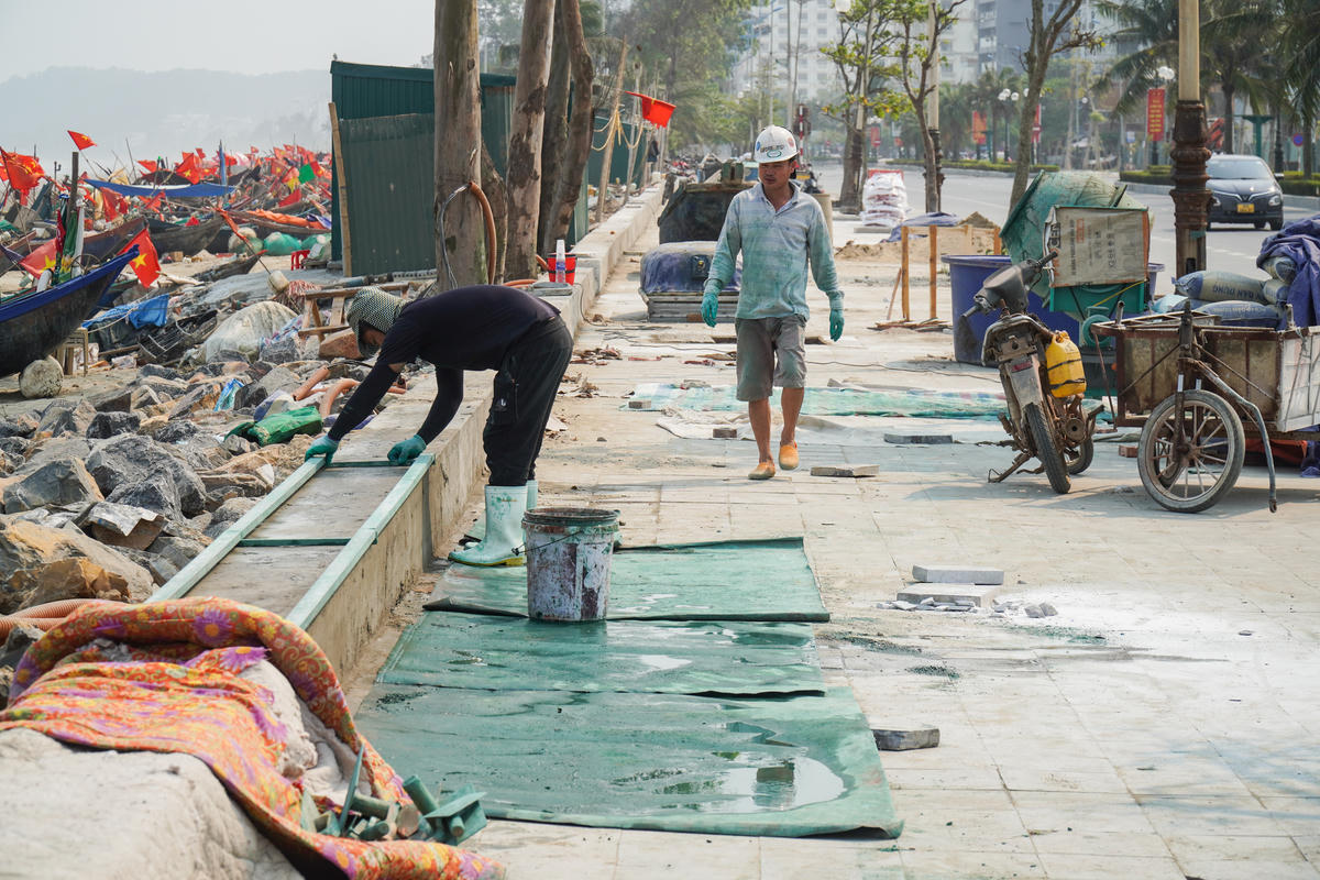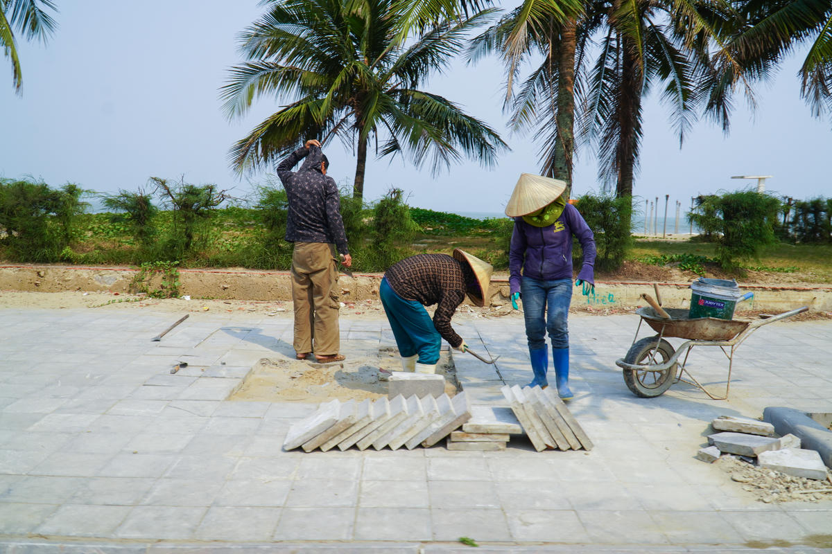 Trên nhiều tuyến đường và khu vực ven biển, không khí thi công diễn ra khẩn trương. Các hạng mục hạ tầng bị hư hỏng như vỉa hè, bó vỉa, mặt đường đang được rà soát, sửa chữa đồng loạt. Ảnh: Đình Minh