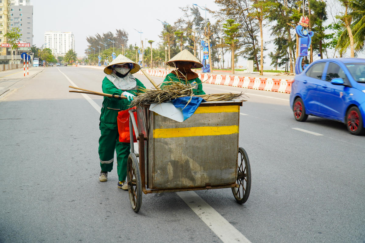 Cùng với đó, công tác vệ sinh môi trường được tăng cường với tần suất cao. Lực lượng công nhân thường xuyên thu gom rác thải, làm sạch bãi biển để phòng giữ gìn không gian du lịch sạch đẹp. Ảnh: Đình Minh