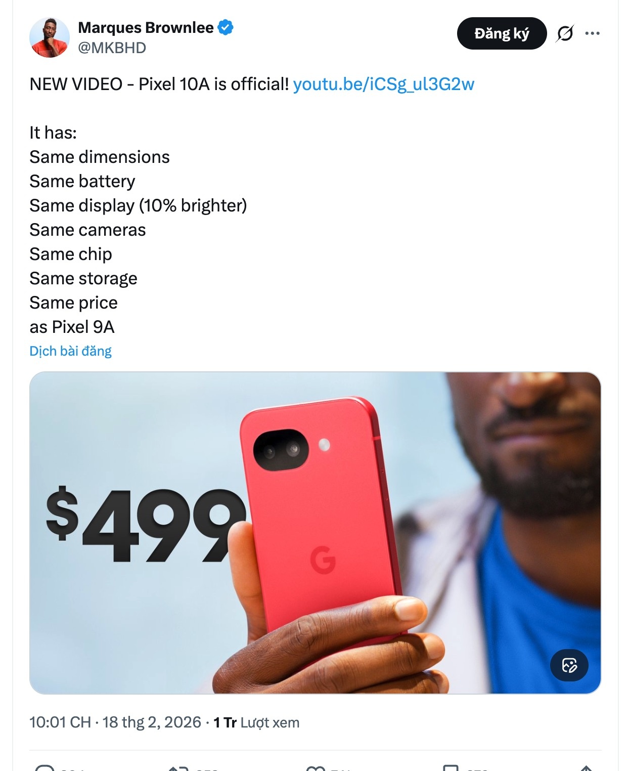 Tuần trước, reviewer Marques Brownlee đăng tải video trải nghiệm nhanh chiếc Pixel 10A với tiêu đề đầy tính giễu nhại: (Chưa) Từng thấy cái này trước đây. Lý do từ việc hãng Mỹ gần như chỉ thay đổi màu sắc và đặt một cái tên mới cho chiếc máy họ ra mắt vào năm ngoái.