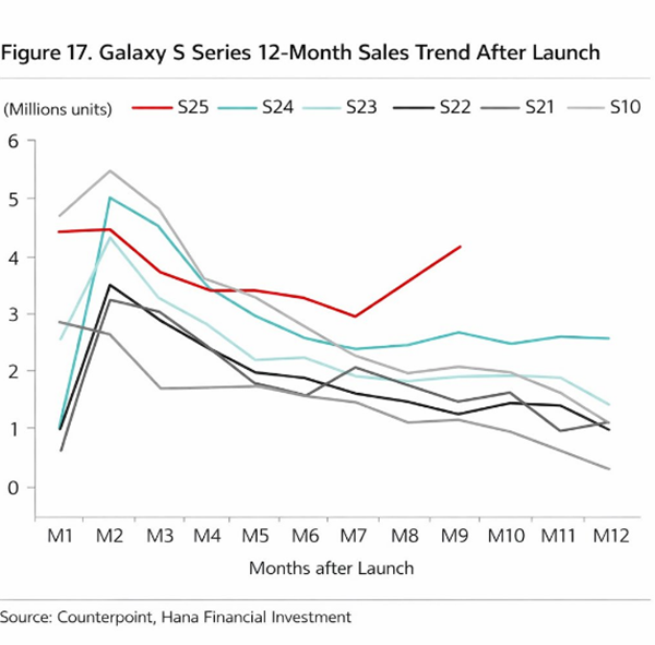 Dẫn số liệu của Counterpoint Research và Hana Financial Investment, tài khoản công nghệ X Ice Universe chỉ ra một hiện tượng bất thường trong biểu đồ doanh số của Samsung Galaxy S25: ở tháng thứ 8 và thứ 9 đà giảm không những bị đảo chiều mà còn chứng kiến mức tăng cao bất thường, giúp dòng điện thoại này chính thức vượt mốc 30 triệu chiếc bán ra – sự phục hồi mà hiếm có mẫu thiết bị Android cao cấp nào đạt được.