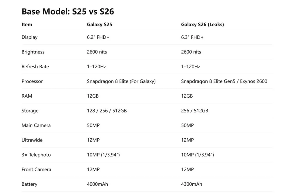Rò rỉ cấu hình Galaxy S26 cho thấy máy được tăng dung lượng pin, bổ sung tùy chọn lưu trữ, tối ưu hiệu năng chip nhưng vẫn giữ nguyên cụm camera nhằm duy trì mức giá cạnh tranh. (Nguồn: UniverseIce/X)