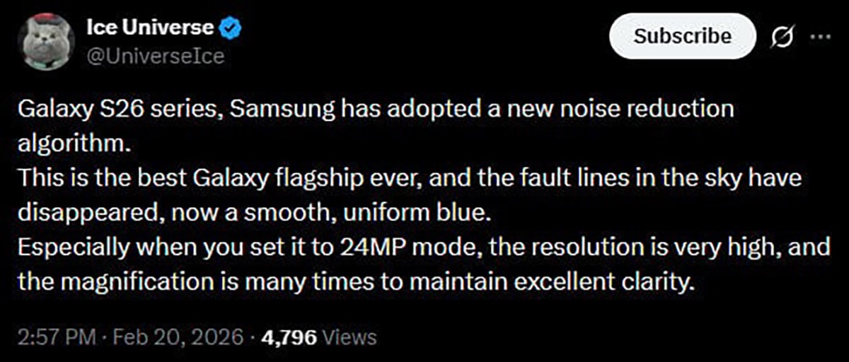Theo chuyên gia tin đồn Ice Universe, Samsung đang chuẩn bị trang bị cho Galaxy S26 một thuật toán giảm nhiễu hoàn toàn mới. Sự kết hợp giữa phần cứng hiện có và thuật toán này được kỳ vọng sẽ giúp Galaxy S26 đạt được chất lượng ảnh tốt nhất từ trước đến nay trên một thiết bị Galaxy.