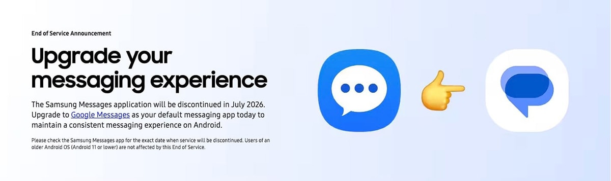 Kể từ năm 2024, Samsung đã ngừng cài đặt sẵn ứng dụng này song song với Google Messages trên nhiều thiết bị. Đáng chú ý, dòng Galaxy S26 mới nhất hiện nay thậm chí không còn cho phép người dùng tải về Samsung Messages. Các thiết bị khác cũng sẽ dần mất khả năng truy cập hoặc tải lại ứng dụng này sau thời điểm chính thức bị vô hiệu hóa.