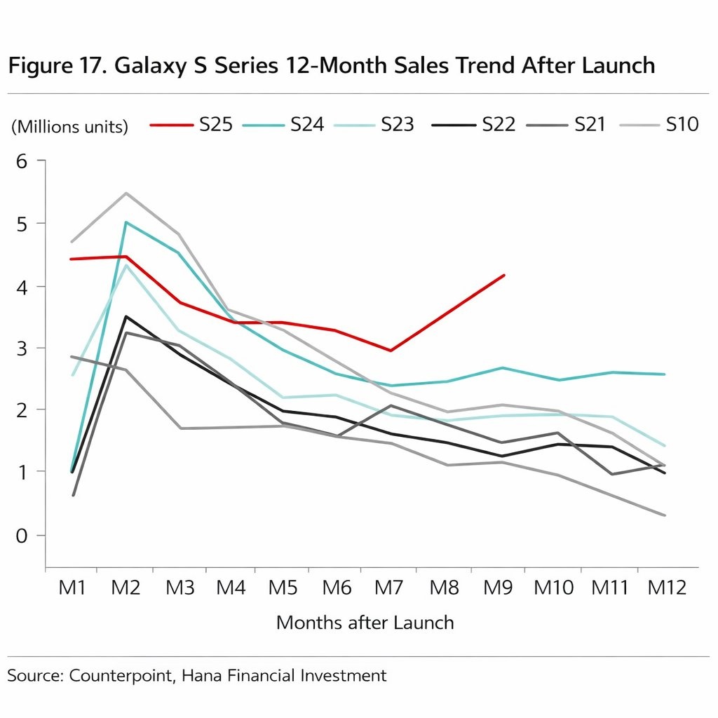 Theo biểu đồ doanh số blogger IceUniverse cung cấp, Galaxy S25 series gần như phá vỡ “lời nguyền flagship Android”. Ở tháng thứ 8,9 sau khi ra mắt, doanh số không đi theo đường cong sụt giảm điển hình mà bật tăng, sức mua hồi phục hiếm thấy. Chính hiệu ứng đuôi dài giúp tổng 3 máy đã đạt hơn 30 triệu chiếc bán ra trên toàn cầu.