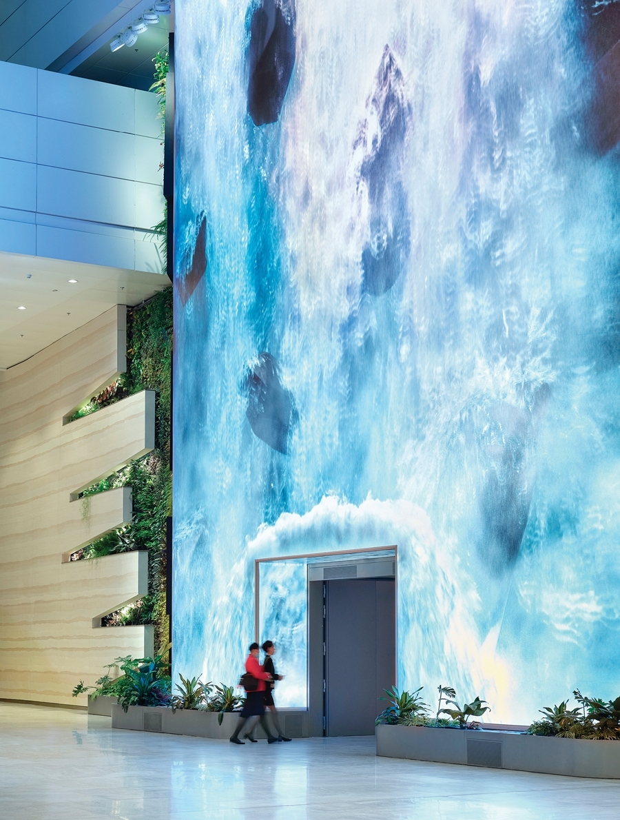 Cổng kiểm soát nhập cảnh được bao quanh bởi thác nước kỹ thuật số cao khoảng 13,6 mét, gây ấn tượng mạnh về thị giác cho hành khách. (Ảnh: Interiordesign)