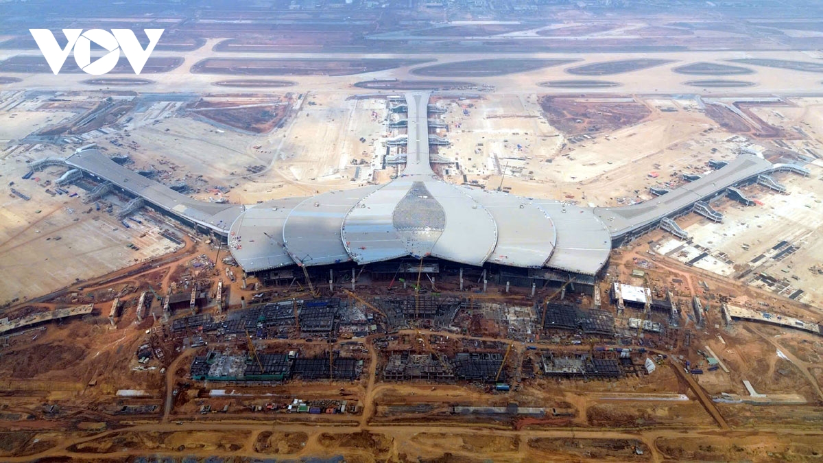 Phần kết cấu mái vòm trung tâm và hai cánh nhà ga đang được triển khai gấp rút. (Ảnh: AT)