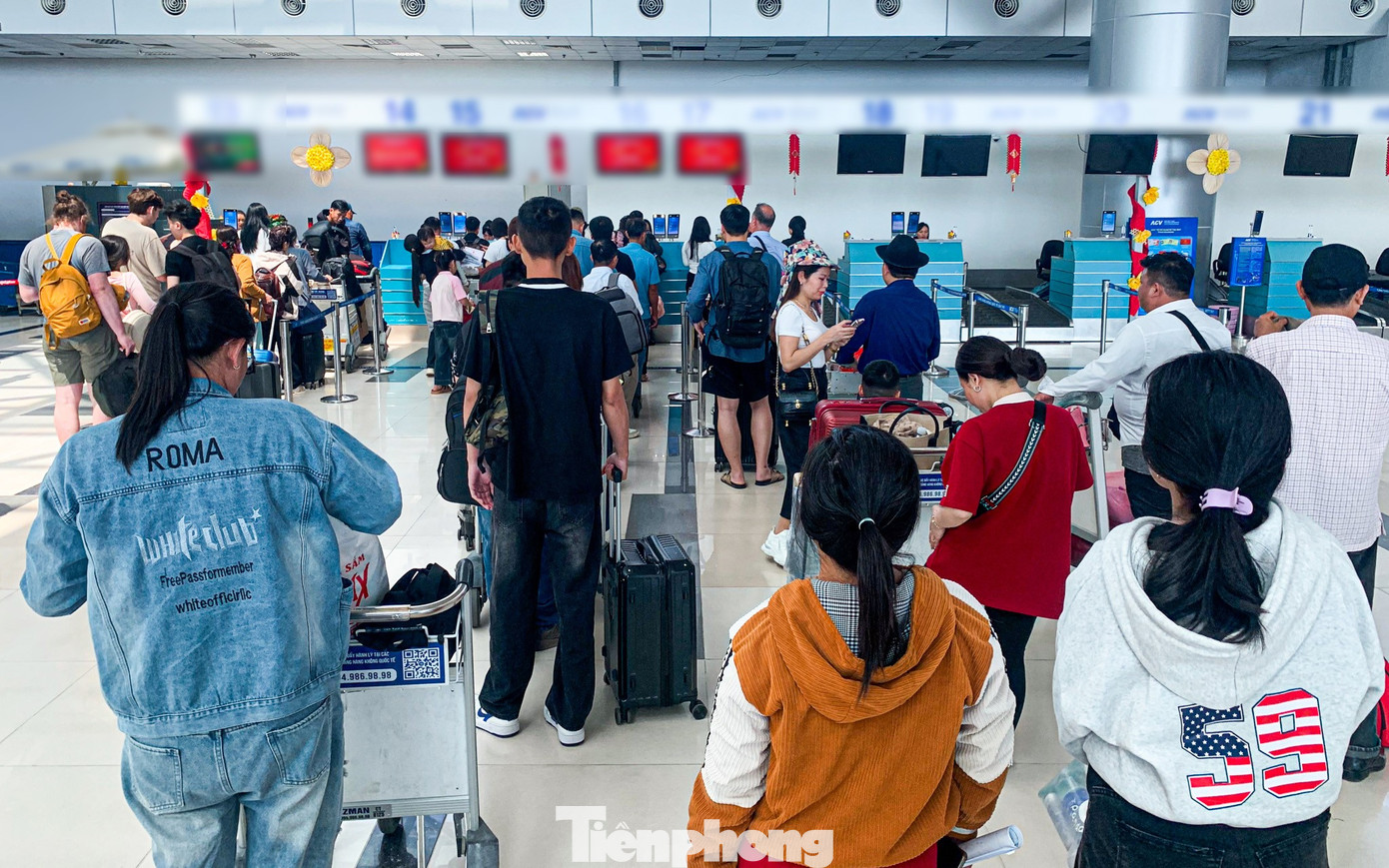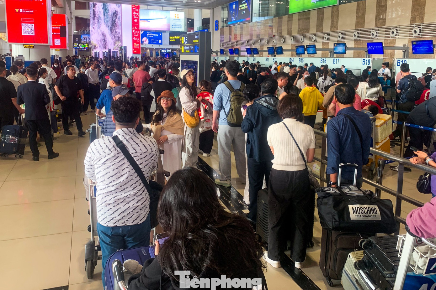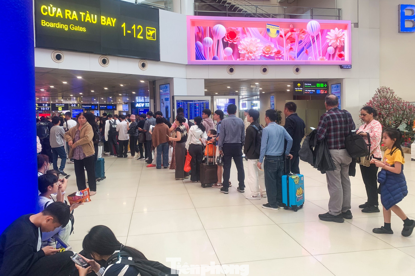 Khu vực ga quốc nội sân bay Nội Bài đông nghẹt người. Do các phòng chờ đều kín chỗ, nhiều hành khách đành ngồi tạm dưới sàn hoặc dọc lối đi để chờ chuyến bay
